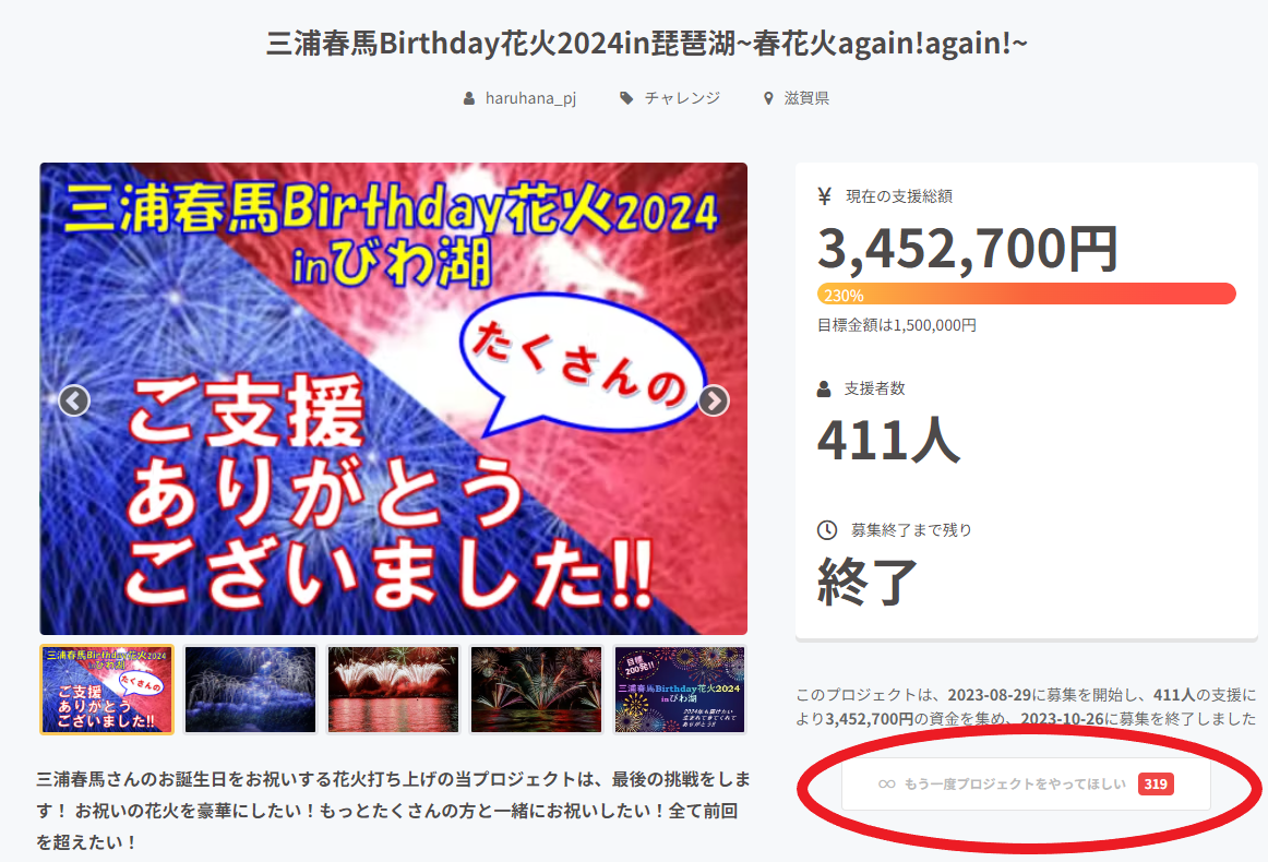 ここからまた不安との闘いですが、「もう一度プロジェクトをやってほしい」にいただいた319のポチを勇気に変え、進んでまいります。長らくお付き合いいただきました「三浦春馬Birthday花火2024inびわ湖」は、これにて閉幕です。たくさんの愛をありがとうございました!