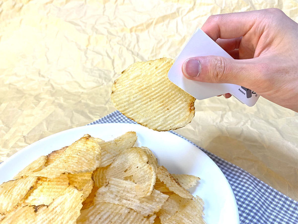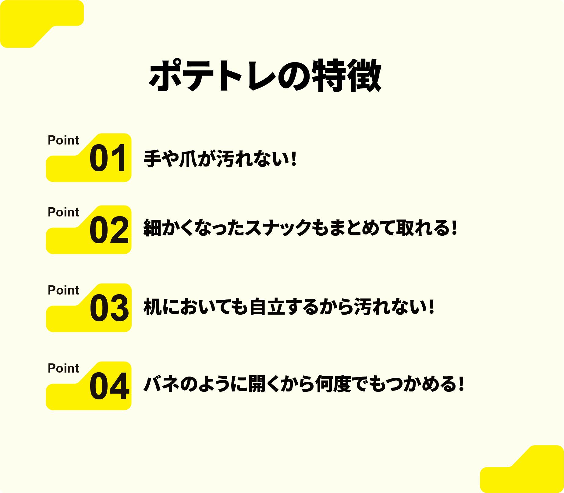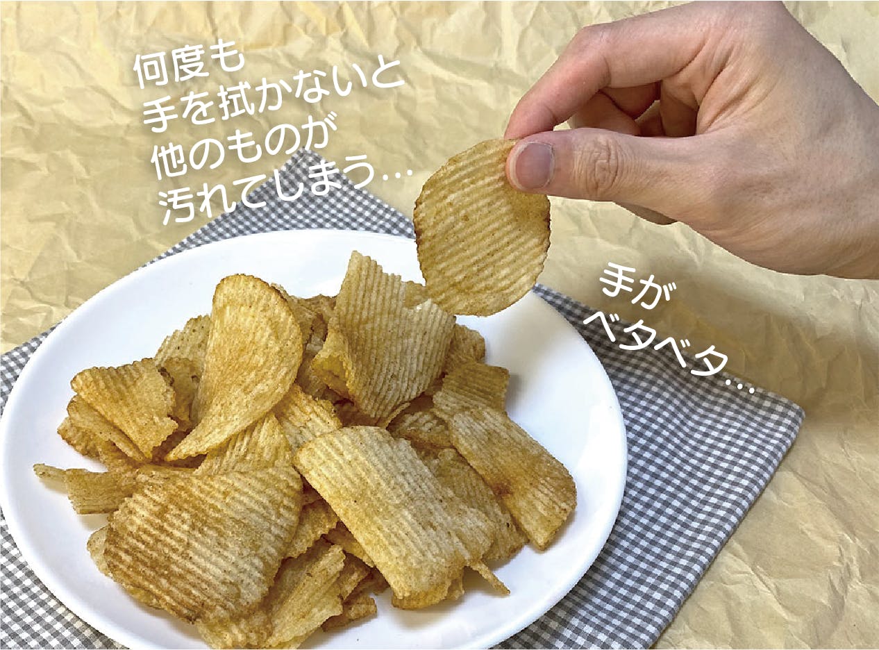ポテトレの最大の特徴で、ポテトレを使用すれば、手に油をつけずにスナック菓子をつかみ食べれます!