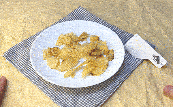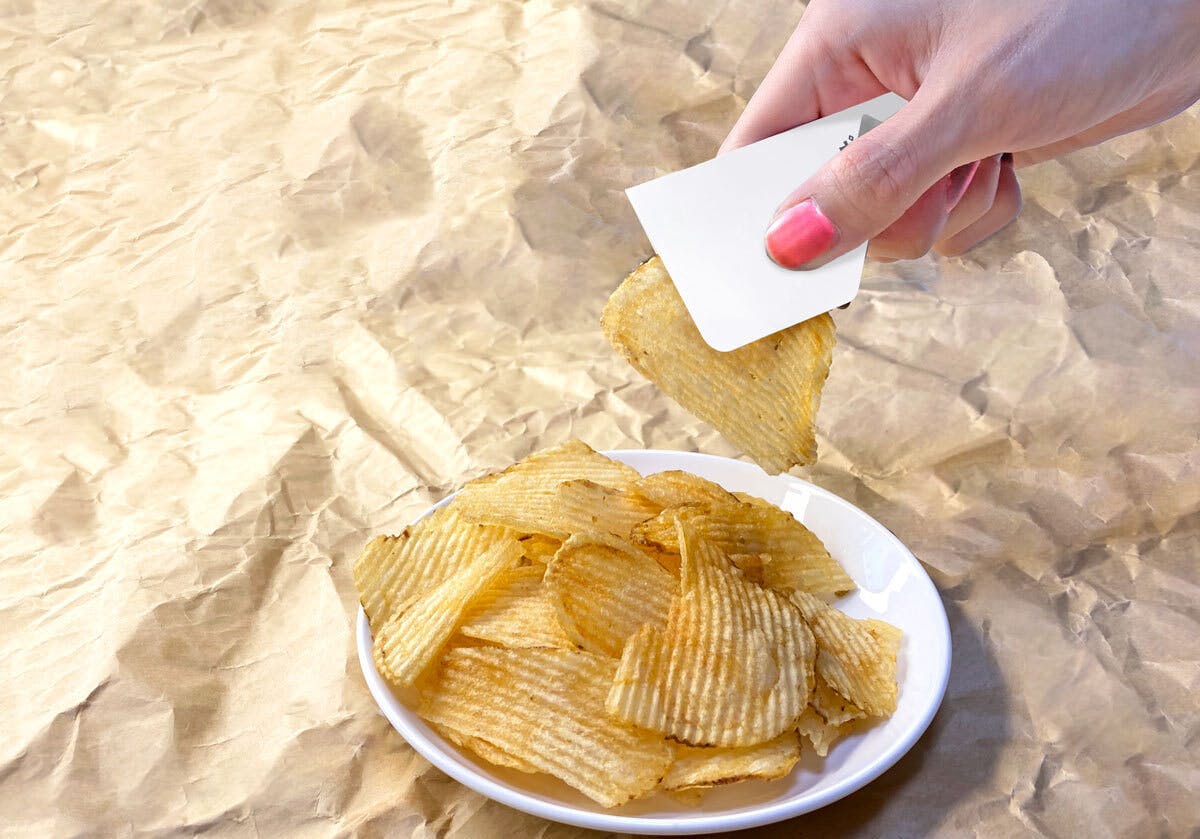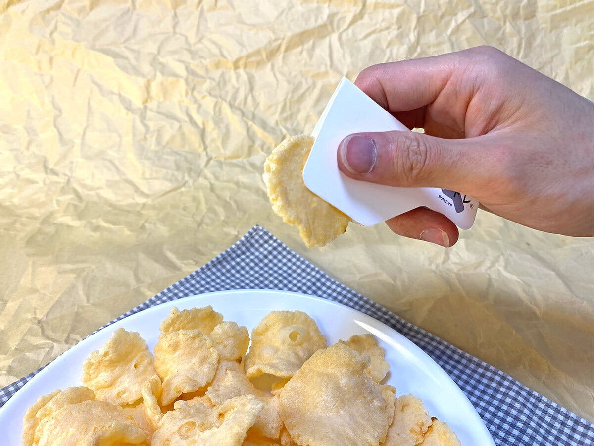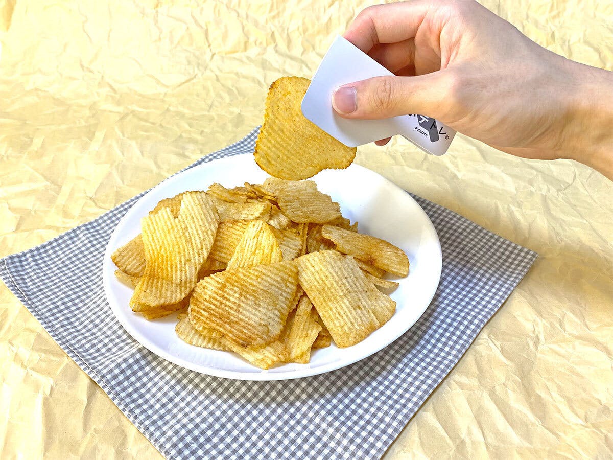 ポテトレの最大の特徴で、ポテトレを使用すれば、手に油をつけずにスナック菓子をつかみ食べれます!