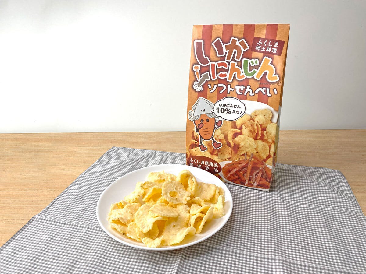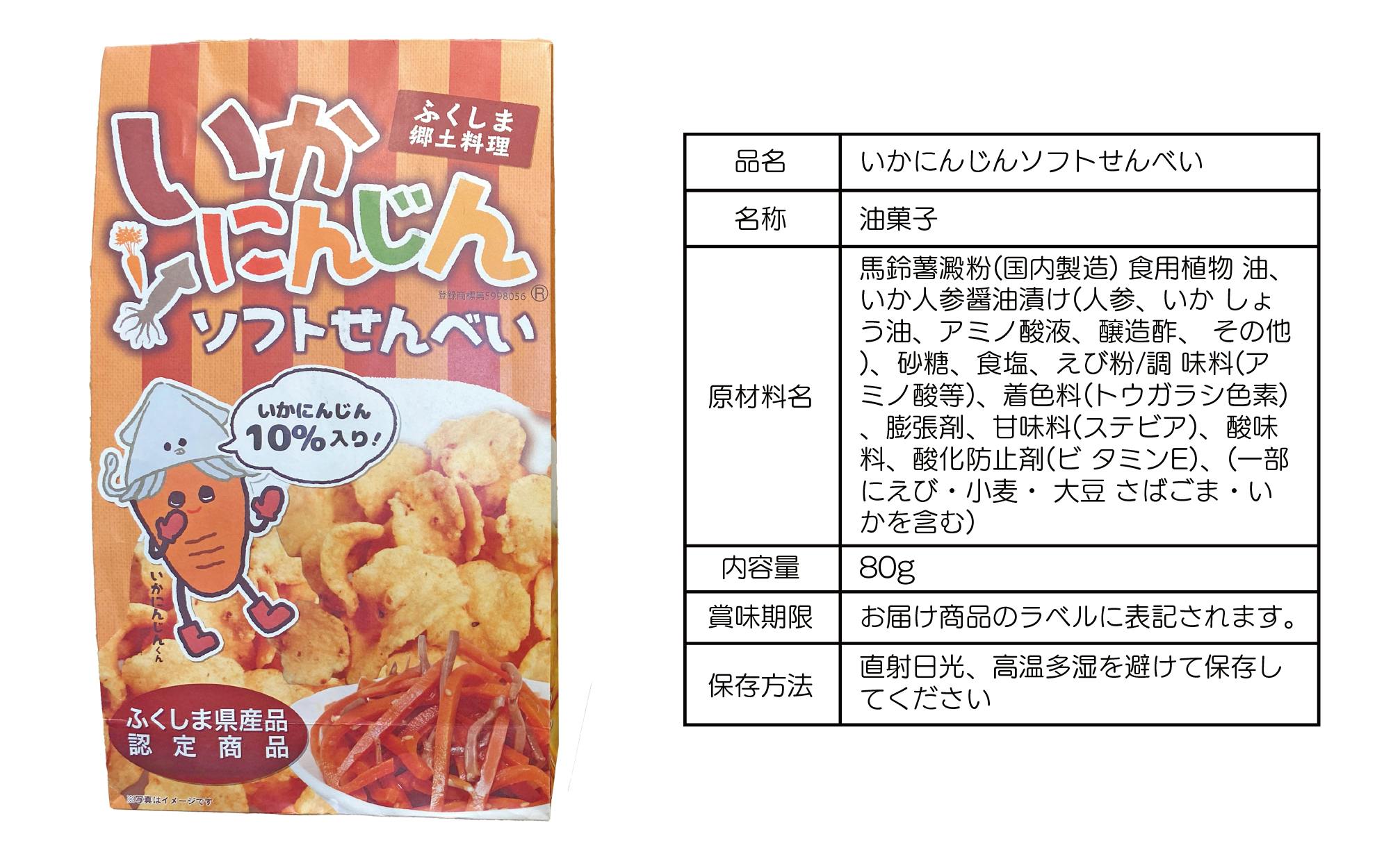 いかにんじんソフトせんべいは販売されている「郷土料理いかにんじん」を10%せんべいに練り込んで食べやすいようにふんわりソフトに焼き上げました。
