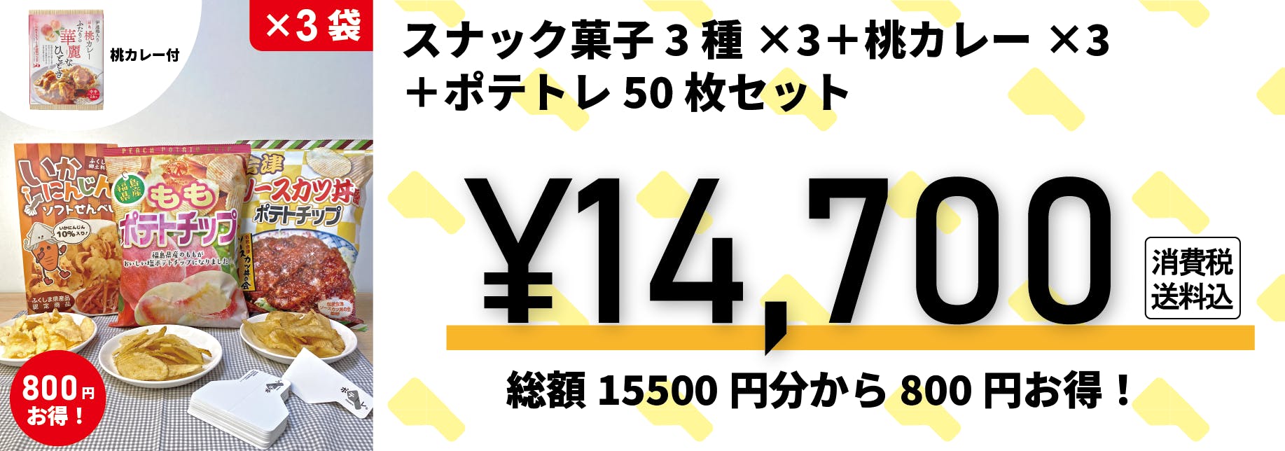 スナック菓子3種×3+福島 桃カレーふたりの華麗なひととき 1箱(2食入り)×3+ポテトレ50枚セット:約30cm×45cm×40cm(縦×横×高さ)