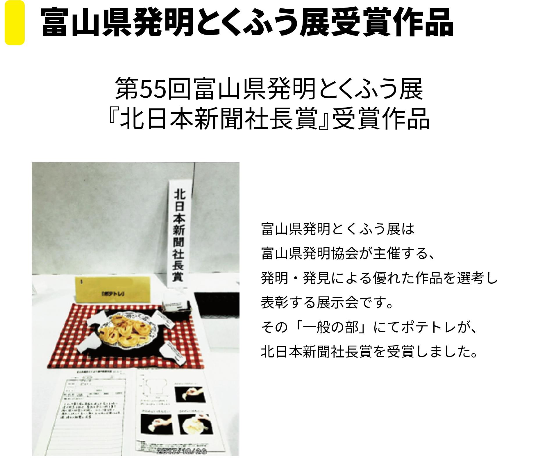 平成29年7月に、富山県発明協会様に指導を受けながら特許(意匠)を取得しました。その2ヶ月後に、第55回富山県発明とくふう展が開催されたため、思い切って一般の部で応募しました。その結果、『北日本新聞社長賞』に受賞することができました。ふと思いついたことが意匠登録され、賞まで頂けたことは、私の発明に共感して貰えたと感じ、とても嬉しかったです。