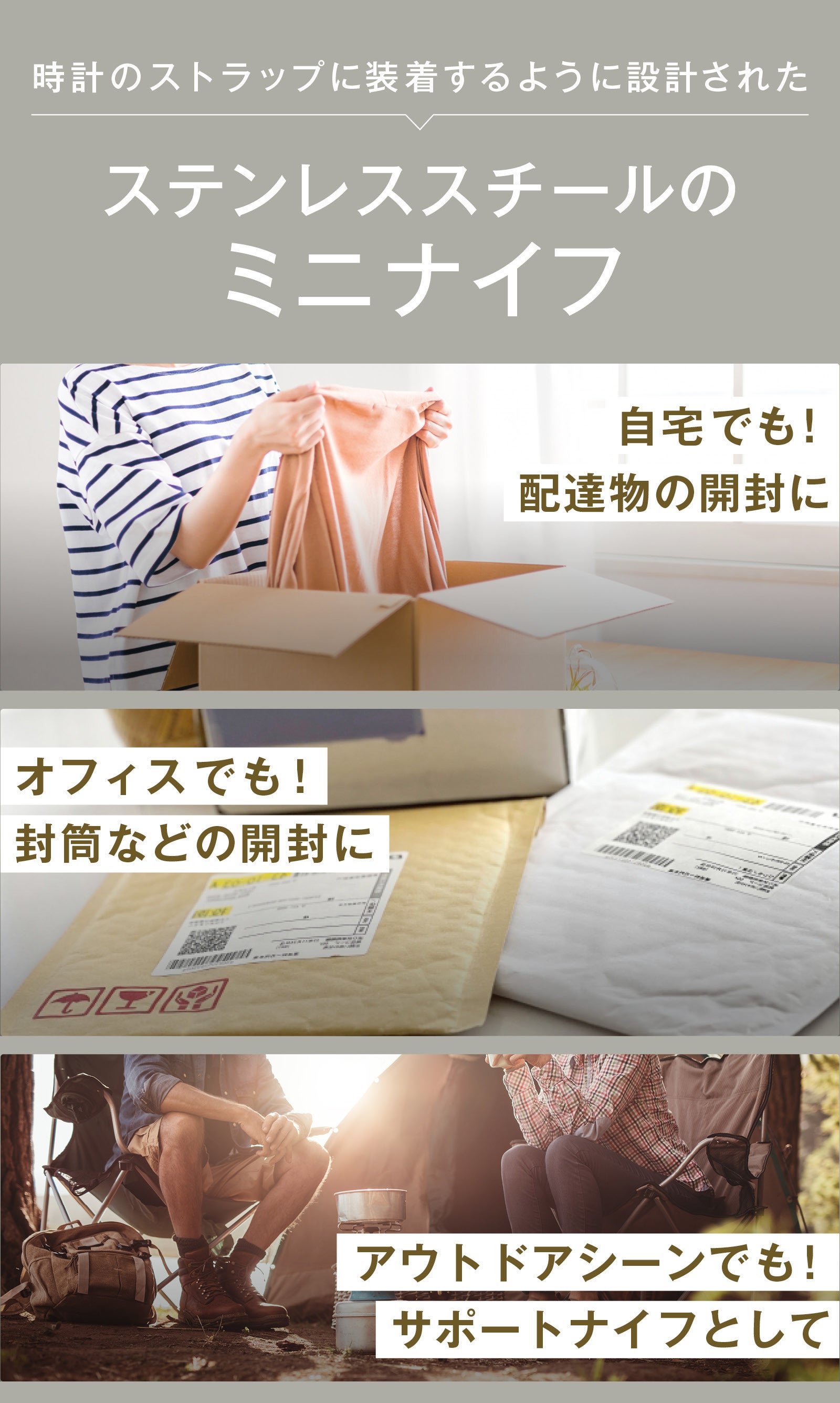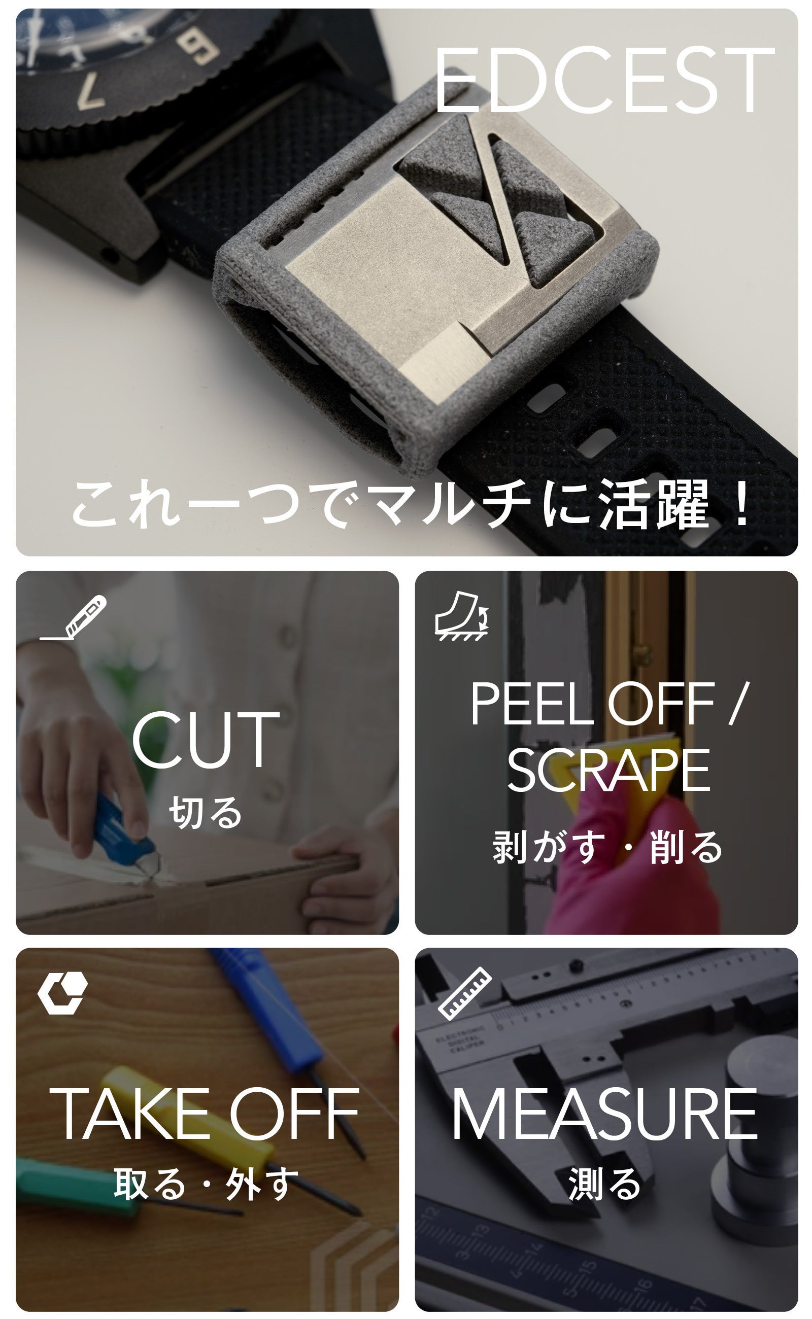 「お菓子の袋が開けられない」「届いた荷物を開封したい」生活でナイフが必要な場面って、結構ありますよね。 そんな時に、ちょっとしたナイフが手元にパッと出てきてサッと使えたら便利! EDCESTは、時計のストラップに装着する、身につける超小型・軽量のナイフです。