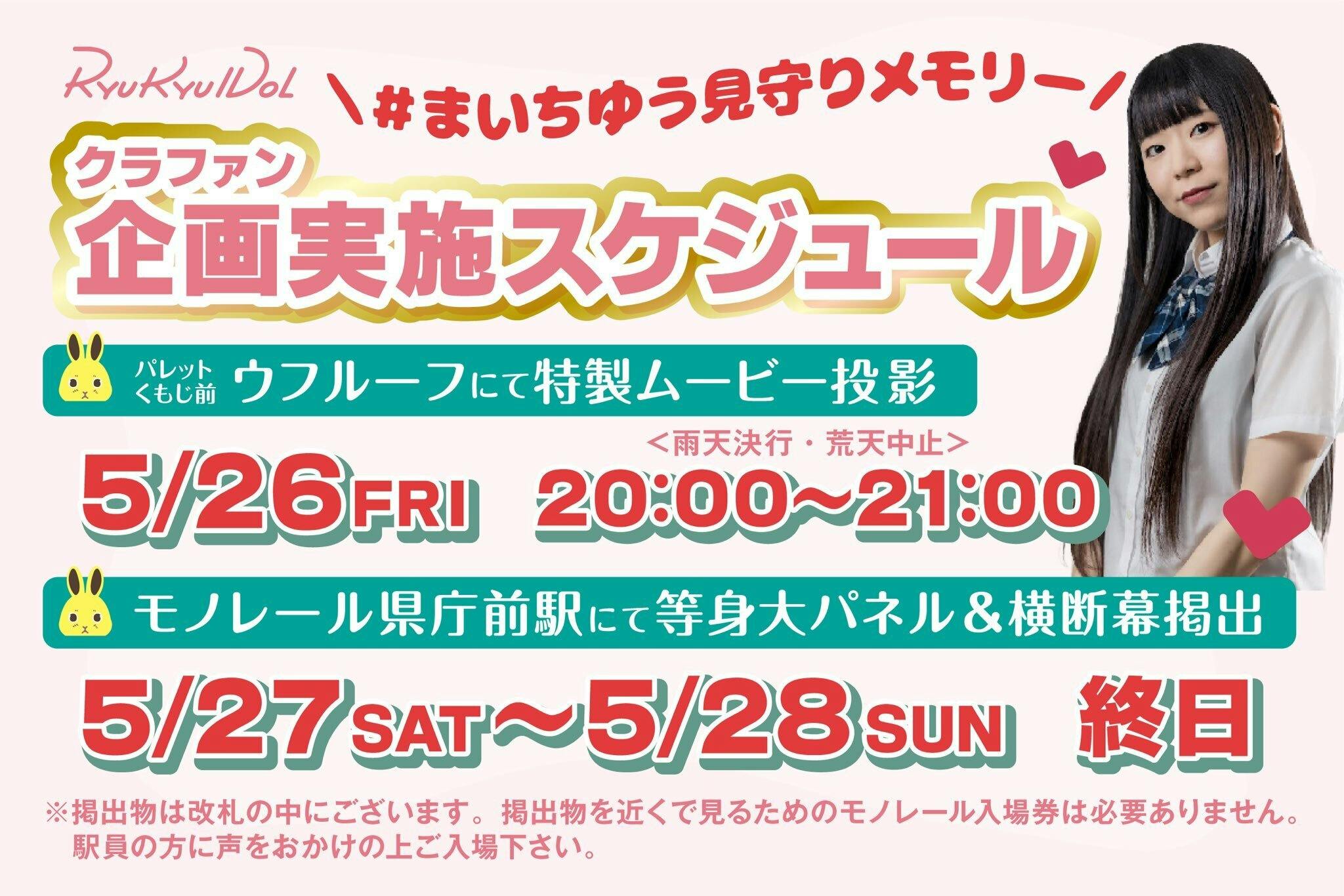 2023/05/26 13:36総支援金額 868,000円 達成率124%クラウドファンディング"超"大"成"功"!みなさまの熱い愛が大きな成果として実を結びました!そして、本日20:00よりパレットくもじ前ウフルーフにてまいちゆう巨大映像投影が実施されます!そして翌日5/27土曜日の始発よりゆいレール県庁前駅にて巨大横断幕&まいちゆう等身大パネルの掲出が行われます!ぜひ、ラストライブと併せて足をお運びくださいませ!沖縄アイドルのレジェンド、まいちゆうの最後の花道その感動の瞬間をみなさんで見守りましょう! もっと見る