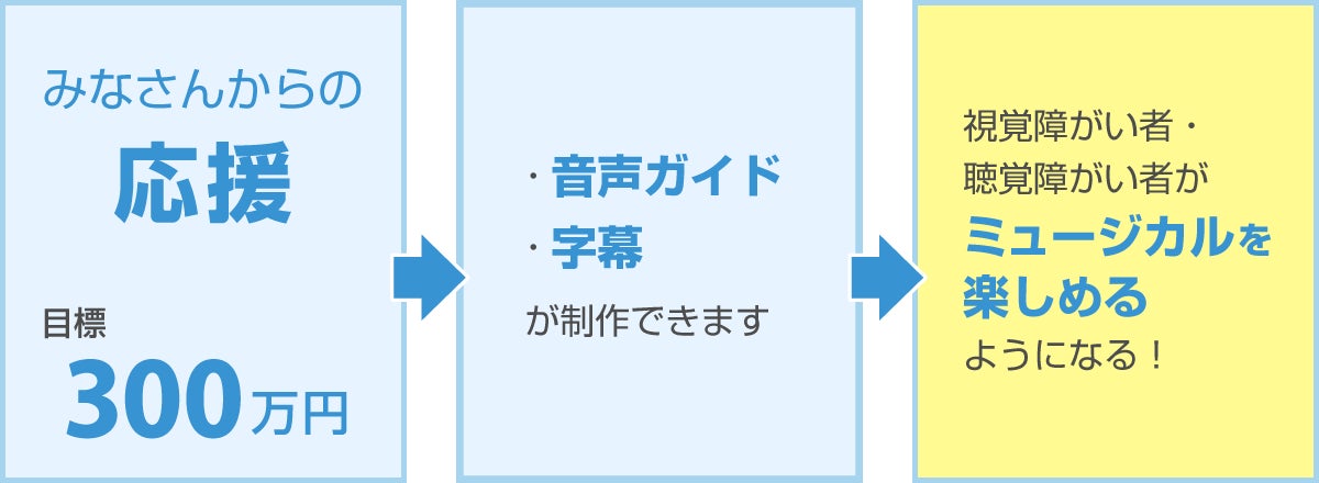 その「Musical For All ーあらゆるひとに参加と鑑賞の機会をー」の取り組みの最初のステップとして、見えない人、聞こえない人が、ミュージカルを鑑賞するために必要となる「音声ガイド」と「字幕」を制作します。