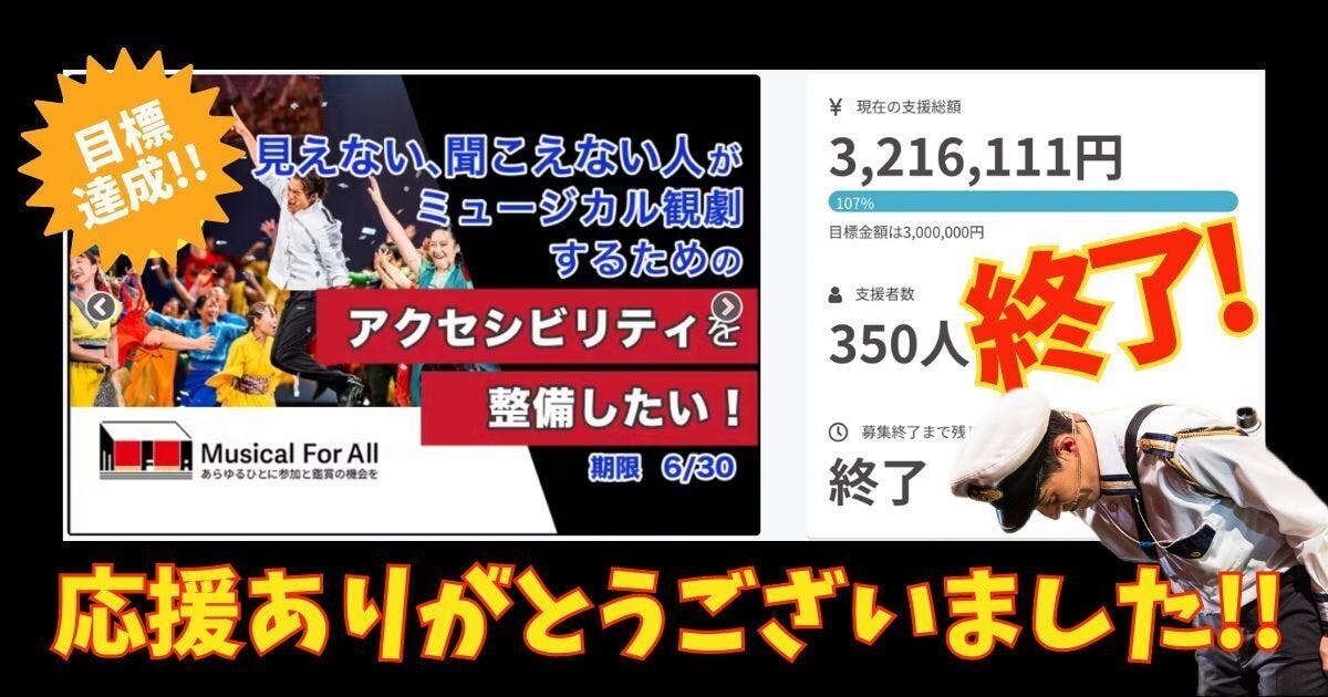 2023/07/04 10:08おはようございます!コモンビート代表の安達です。6月30日(金)23:59にクラウドファンディング「見えない・聞こえない人がミュージカル観劇するためのアクセシビリティを整備したい!」が終了しました。350人から3,216,111円をご支援いただき、無事に成功となりました!応援をいただいたみなさま、本当にありがとうございました!!このクラウドファンディングにより、字幕と音声ガイドを制作する費用がまかなえることとなり、「Musical For All ーあらゆるひとに参加と鑑賞の機会をー」のプロジェクトとしてもはじめの一歩を踏み出すことができるようになります。音声ガイドや字幕があることで、見えない人、見えづらい人、聞こえない人、聞こえづらい人をコモンビートのミュージカルにウェルカムする準備がようやく整います。これを整えればご来場いただけるということではなく、あくまでも土台が整ったということですね。海外の映画に日本語字幕があたりまえについているように、ようやく彼らにとってのアクセシビリティが整ったということです。今後はさらにこのミュージカルを観てもらえるように、情報提供の仕方にも工夫をして、彼らに情報が届くように仕掛けていきます。8月の東京公演が、字幕・音声ガイドを実装する初めての公演となります。ぜひご来場いただき、より多様な人が来場する会場や多様な観劇の仕方がある客席の雰囲気を感じていただければと思います。ぜひチケットをお買い求めください!(→公演情報・チケット販売サイト)みなさまのおかげではじめの一歩を踏み出すことができましたが、Musical For All の挑戦はまだまだ続きます。このクラウドファンディングに続いて、7月下旬から8月にかけて(期間調整中)、マンスリーファンディングを立ち上げて、子どもたちの招待費用をまかなうための資金調達キャンペーンを行う予定です。未来を担う子どもたちに心に響く舞台を届けていければと思っています。お願いばかりで恐縮ですが、あらゆるひとにミュージカル「A COMMON BEAT」への参加と鑑賞の機会を届けるために応援いただければ幸いです!改めまして、クラウドファンディング「見えない・聞こえない人がミュージカル観劇するためのアクセシビリティを整備したい!」に応援をいただき、ありがとうございました!NPO法人コモンビート理事長 安達亮 もっと見る