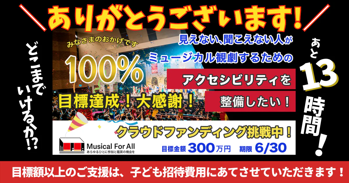 昨日22時25分に目標金額300万円を達成し、クラウドファンディング「見えない・聞こえない人がミュージカル観劇するためのアクセシビリティを整備したい!」が無事に成功しました!