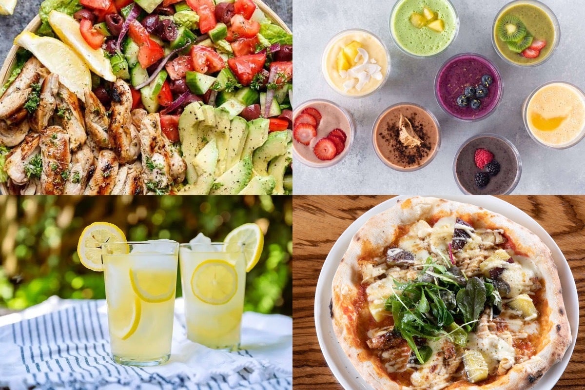 左上から低温調理チキンのコブサラダ、多摩ミックスフラッペ、自家製裏山レモネード、テリヤキチキンと秋川とうもろこしのピザ