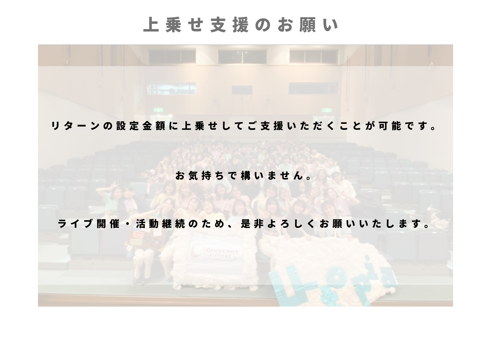 先輩方が繋いでくださったCrescentPartyという大切な私たちの居場所、そしてサークル員の憧れの場であるサークルライブを引き継ぎ、未来のCrescent Partyへ繋いでいきたいという強い想いから、今年度もクラウドファンディングを行うことに決定いたしました。お客様に最高のステージをお届けしたい、そして未来に「繋ぐ」、そんな意味のあるライブにしたいと思っております。サークルライブの成功と、サークル維持・活性化のため、ご支援いただけると幸いです。
