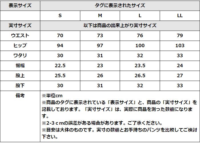 LL:ウエスト79、ヒップ103、ワタリ33、裾幅24、股下33、股上24