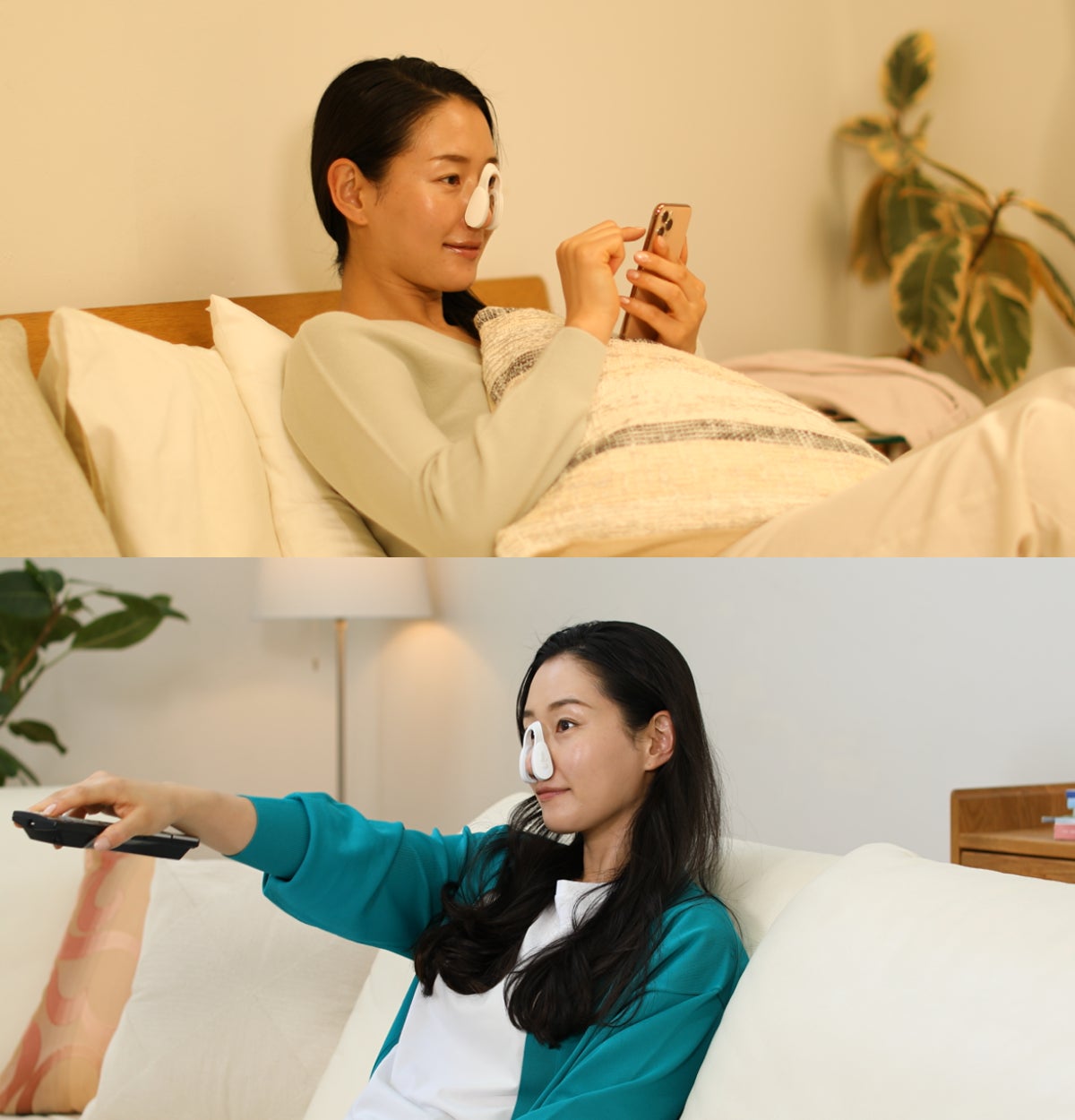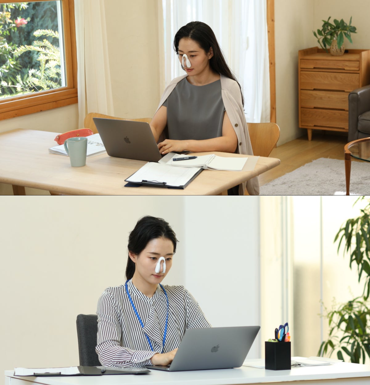 ③挟む幅が広いほうを顔側に向けて装着してください。ズレにくい固定できる位置に装着します。