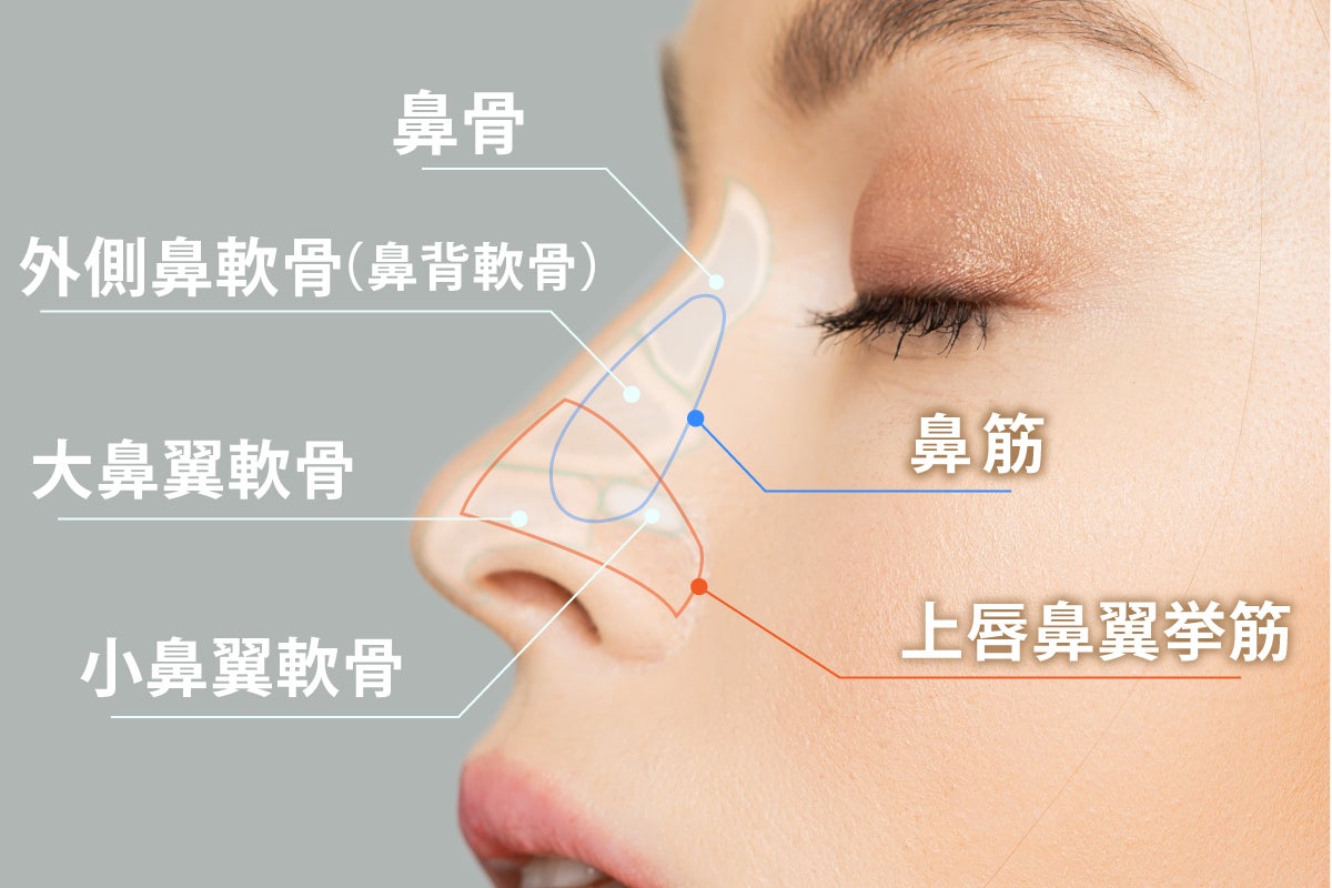 →鼻の高さは骨ではなく、『軟骨』と『筋肉』によって変化していきます!これを解決するには、軟骨の位置の修正と鼻の筋肉の筋トレです!