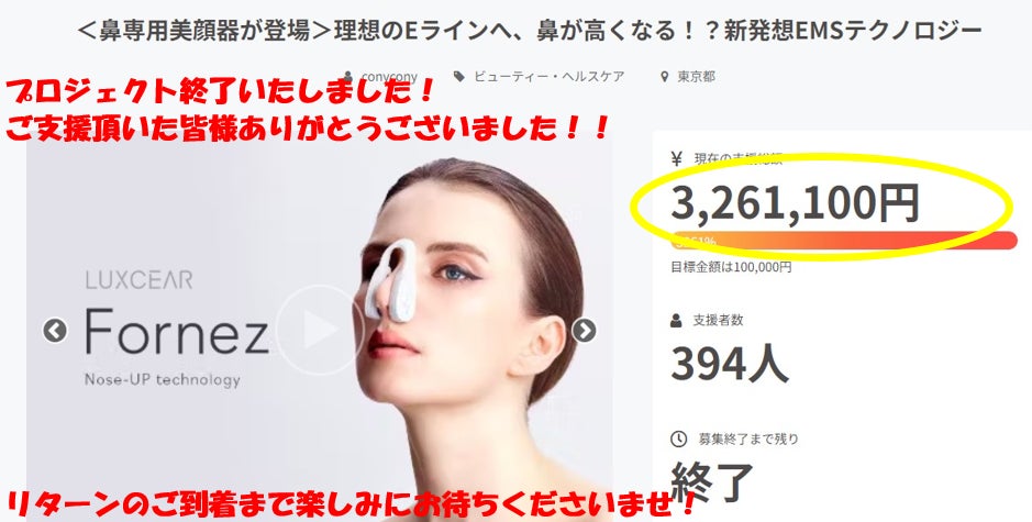 2023/06/29 12:11この度は本プロジェクトにご支援頂きまして誠にありがとうございます。現在342名の方に2,823,700円のご支援を頂いております。先行販売も残り3日となり、プロジェクト終了後はいち早く支援者様にリターンをお届けできるように準備を進めておりますので、楽しみにお待ちいただけますと幸いです。▷今回は残り3日となり、改めてFornezのこだわりのポイントを紹介いたします。FornezのEMSケアができる特殊な電極シートは、面倒なジェルやパッドの交換もありません。「月々ジェルのコストがかかるから…」「パッドシートを交換するのが面倒でやめてしまった…」などのお悩みも一切不要です。ランニングコスト無しで使えるから手軽に美鼻ケアを可能にすることができます。また装着するだけのハンズフリーなのでどこでも、どんな時でもOK。1日10分のケアで鼻ケアをしてみてくださいね。更なるご支援を頂きたいと思っております。応援コメントもたくさん頂き、残り日数頑張っていきますので、本プロジェクトのシェアを頂けますと大変嬉しいです!!また詳しい配送スケジュールもこちらに発信していきますので、引き続きよろしくお願い致します。 もっと見る