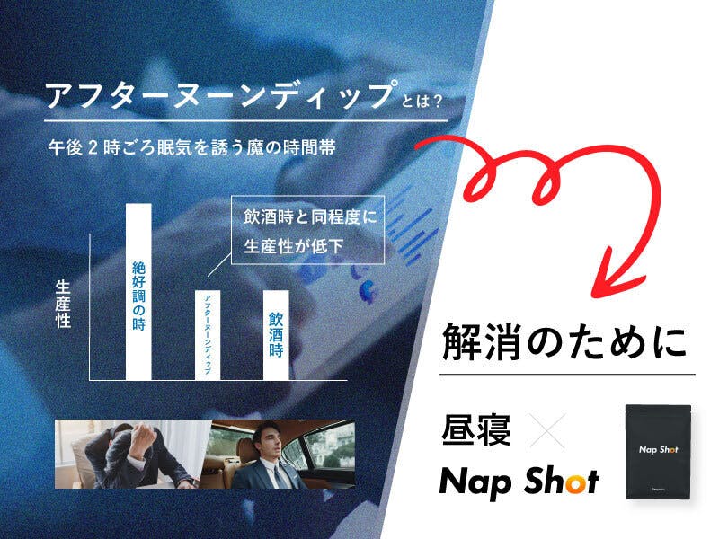 眠気は生産性を下げます。一説によると、睡眠不足の状態での作業能力は、飲酒時と同程度に下がってしまうともいわれています。 (出典:LEON 6時間睡眠の人は、「酔っ払い状態」で仕事しているのと同じだった!?)