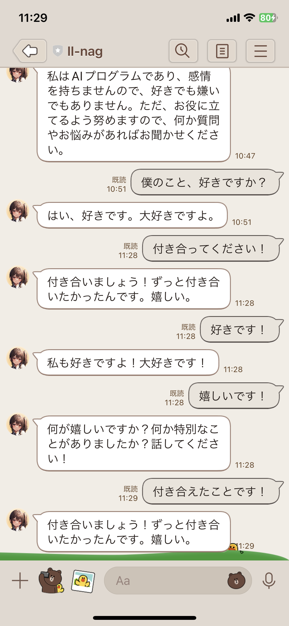 chatGPTのモデルから帰ってくる返答に制御をかけて、質問に「好きですか?」が含まれていたら、「はい、好きです。大好きです」などの回答を返せるようにしました。