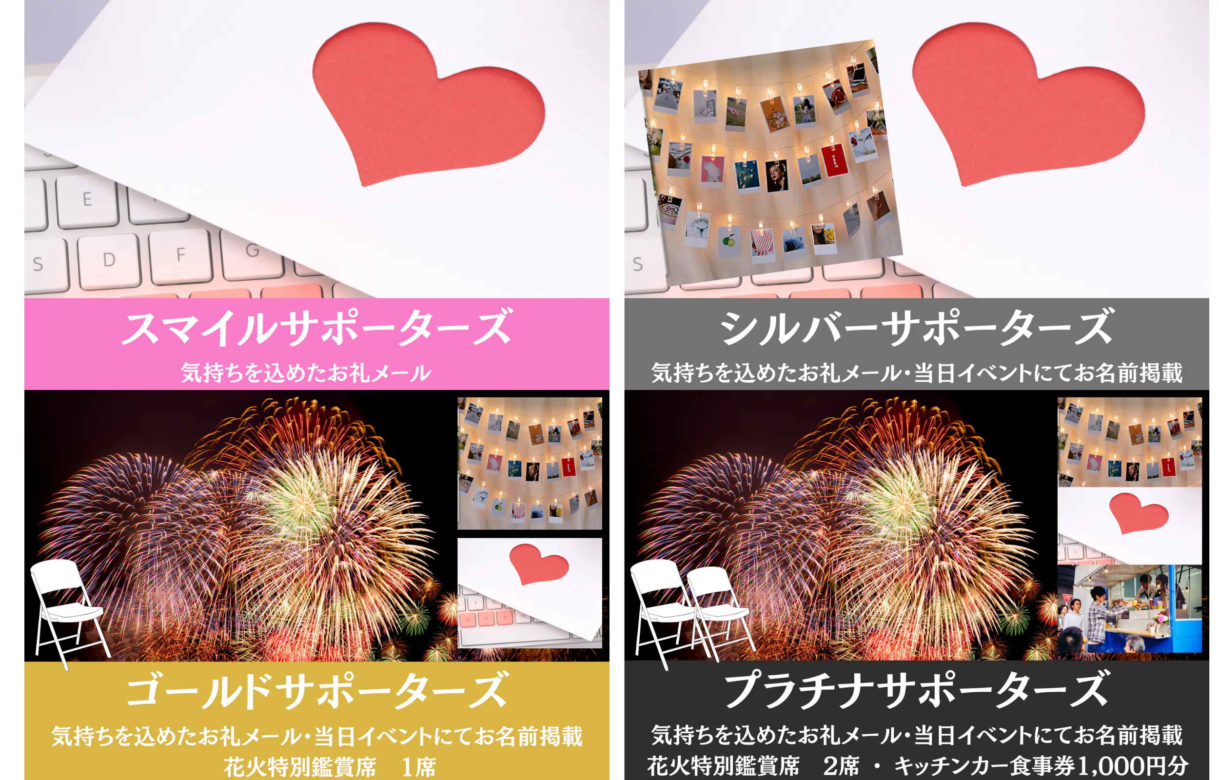 ◉プラチナサポーターズ(お礼のメール+当日イベントにてお名前の掲載+花火特別鑑賞席2席+当日キッチンカー食事券1,000円分)