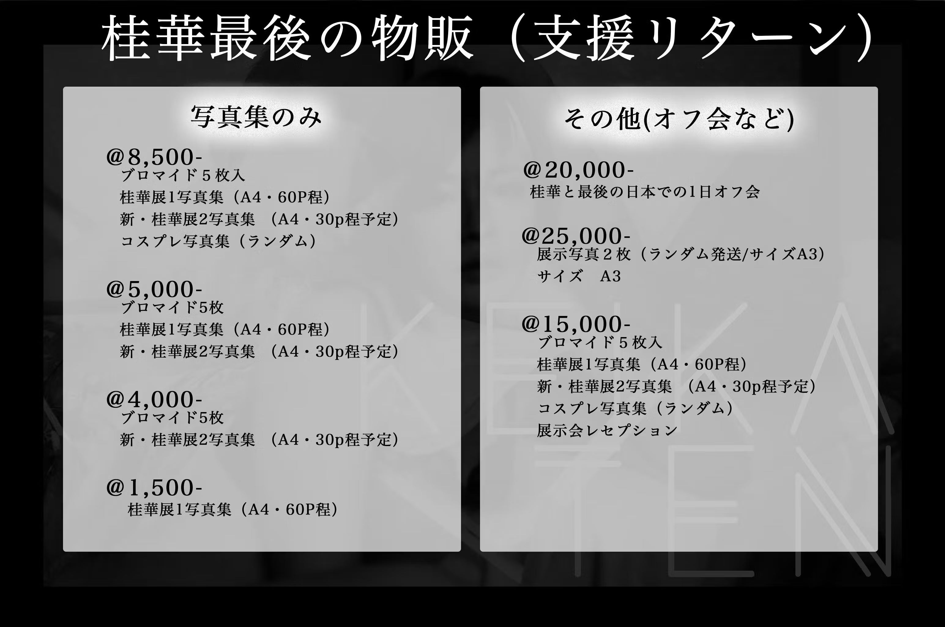 2023/09/06 14:40皆さんお久しぶりです。展示会が終わった後、海外に発つために家の片付け、役所手続きが続きバタバタしており、なかなか皆さんに挨拶ができず申し訳なく思っています。やっと挨拶できる時間ができたので、この時間を借りて、改めて皆さんにお礼をしたいと思います。本当に、今まで桂華を応援してくれてありがとうございました。以下、かなり長くなってしまうので時間があるときによかったら読んでください。これはみんなには言うかどうか悩みましたが…まぁもう立場とか関係ないし、正直に言います。最後の桂華の活動は本当に大変でした。この桂華展を作り上げるための企画と実施までに心身かなりの負担がありました。今回の企画に対して、支援者の皆さんが汗水働いて頑張って私に支援してくれました。その集めたお金で、どうしても協力を仰ぐために、いろんな対価を払わなければなりませんでした。企画書だって頑張って作った。この企画を受け取った一部の方も、忙しいというのし、字も読めないし理解ができないとか言うものだから、その相手にわかりやすくボイスチャットで説明したりした。でも、その人のツイッターを見たら「温泉行く人募集してます」とか「暇な人のみに行こう」とか、忙しいを言い訳にしてばかりで、私が協力を仰いでも結局そういうことで忙しいみたいで何もしてくれなかった。口ではできる限りのことはするって言って結局何もしないで意見ばかり言うだけだった。挙句、企画書や打ち合わせのときに説明してお互い同意したにも関わらず、企画が始まって「そんなの聞いてない」とか言うものから本当に精神的にキツかったです。とくにその時、私は海外で慣れない英語の中パワハラ受けたり、家がなかったり、アイルランドで犯罪に巻き込まれたり、様々なことがあったからより負荷がかかって本当に大変でした。結局その人は終の終まで、自分の要求ばかりしか言わなくて、私を少しでも労う言葉はなかったです。挙句私の動向を第三者に嗅ぎ回っていたようです。私に協力する時間はなくて嗅ぎ回る時間はあったようです。今思い返すと本当に悲しかったし腸が煮えくり返るくらい憤りを感じます。私は支援してくれたみんなが、どんな思いでこの企画にお金を払っていたか知っていました。だからこそ、そんな人にこんな扱いをされてすごく悲しかったしたくさん泣きました。そんな時、助けてくれたのは一部展示者、そして何より支援者の方達でした。この時、彼らに言われたのは「自分たちは桂華ちゃんにそんな思いをして欲しくてお金を払ったわけじゃない。桂華ちゃんが笑顔で門出を迎えるためにお金を払った。だからどんな選択肢でも桂華ちゃんの決断を支持するよ」っていってくれました。これが何故、私が桂華展を諦めずに続けたかの理由です。それから私は「支援したみんなが期待してるからなんとかしなきゃ」ではなく「自分のためだけにやろう」と思ったのでした。それからは、自分のわがままを通しました。この事情を知って協力してくれた皆さんにはかなり私のわがままを聞いてくれました。逆にすごく大変な思いをさせたと思っています。でも、せっかく最後の活動なのに、ずっと他人の目ばかり気にして行動して、苦しんで、泣いて、結局泣き寝入りする自分とお別れしたかったんです。他人が私のこと嫌いだったらそれでもいい。私は私の中で、私のことが嫌いになっても私はその人たちに「今までありがとう」と思えば、それでいいと。私の元に残ってくれた人が、人生で大切にするべき人だと分かれば、それでいいと。桂華展では、私の最後の門出という意味でもあり、そういう人生の取捨選択もした大きな機会でもありました。来てくれた来場者の中には、桂華をずっと応援してくれた方。クラウドファンディング通して応援することを決断してくれた方。海外で写真活動をしているアーティスト。1回だけ撮ったけど応援の言葉を言いに来てくださった方。そして、桂華の活動をするずっと前から撮影してくれた方、様々な方がいらっしゃいました。最近の写真展はカメラマンとモデルの交流の場になりがちなところがあると思います。それは悪いことではないと思っていて、新しい出会いの場というのは素敵なことだと思います。でも私のこの写真展で、ゆっくり私の写真を向き合って欲しいと思ったのです。途中ちょっと混み始めて、一人一人になかなか挨拶できなかったのが心残りですが、、皆さんがそれぞれいろんな解釈で楽しんでくれたら、それが嬉しいです。あの展示会場で笑顔でいてくれた、みんなの顔、思い出すとすごく胸が熱くなる思いです。終わってバタバタしたけど、みんなと笑顔で過ごせたこと誇りに思います。そして私にわがままに付き合ってくれて感謝以外の気持ちはありません。本当にありがとう。私があの桂華展で伝えたかったこと。服を着ていない素の私から、アイルランドの景色