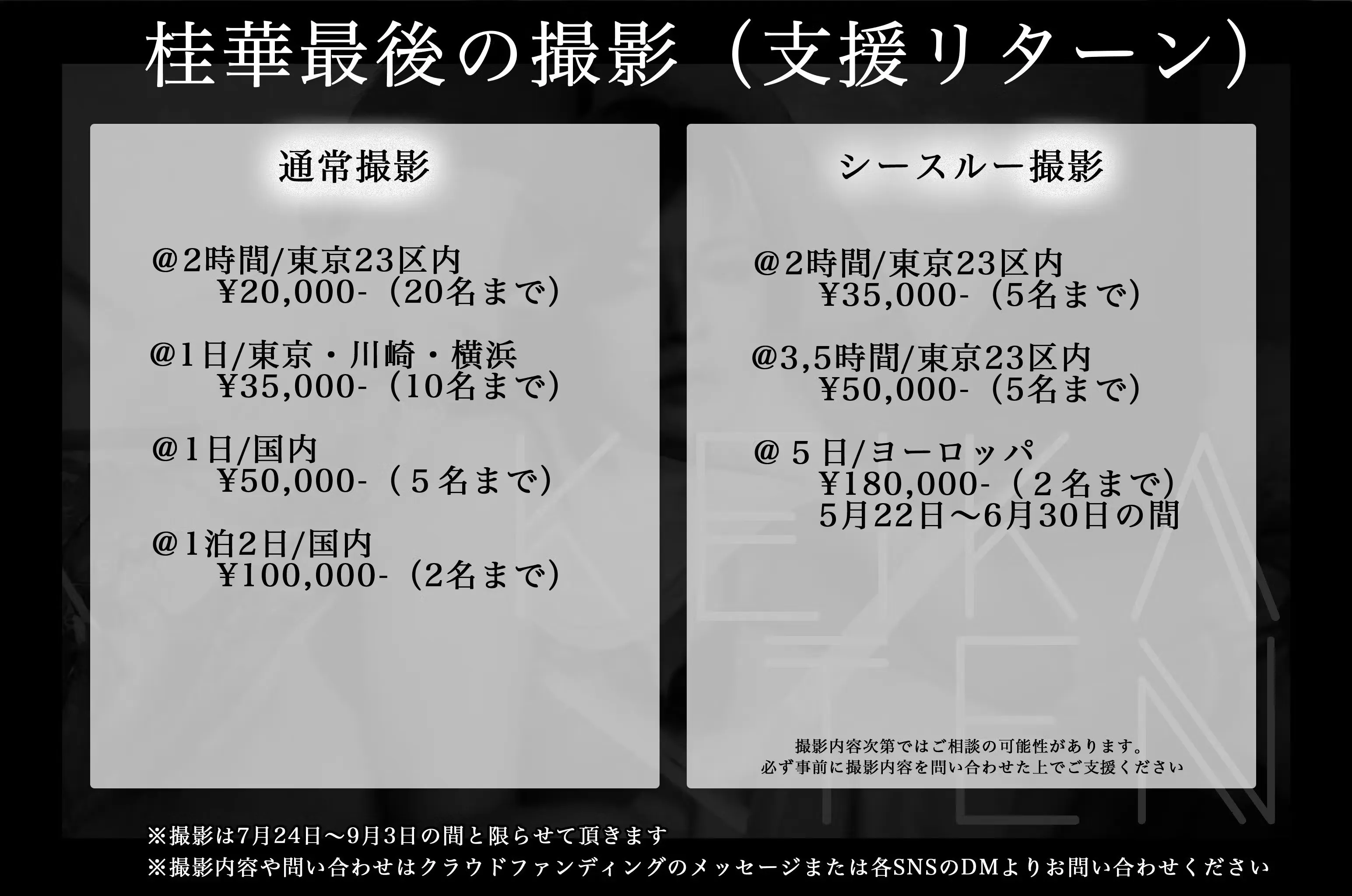 2023年7月下旬〜9月上旬 リターン期間(今回期間が少ないため、展示撮影者の撮影を先に優先してその後通常のリターン撮影に入ります。)