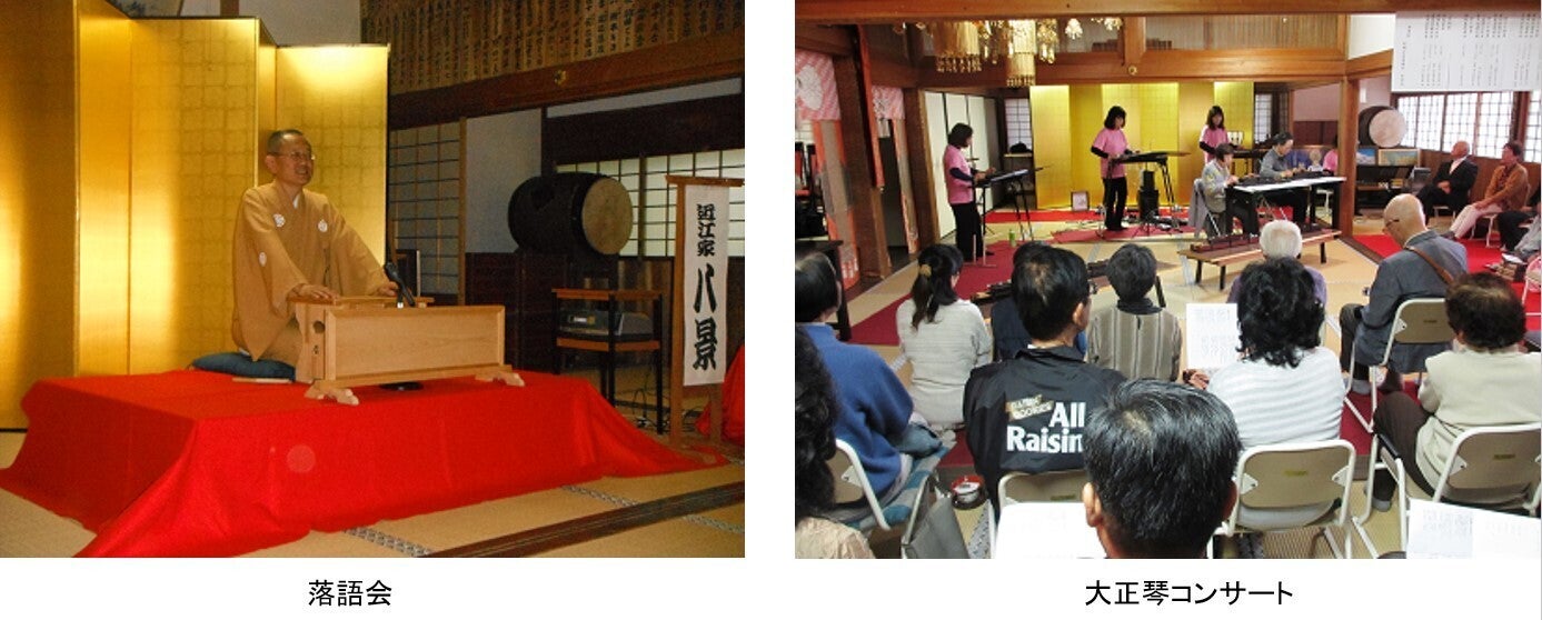 少子高齢化と過疎化が進む地元の町おこしになればと春(4月)のしだれ桜や秋(11月)の紅葉ライトアップを行って地域の人々に公開してきました。また、お寺は地域のコミュニティの中心となり、人の集いの場にしていかなければならないと考え、音楽会・落語会・お茶会なども開催して、多くの人たちが気軽に来ていただける取り組みを行ってきました。