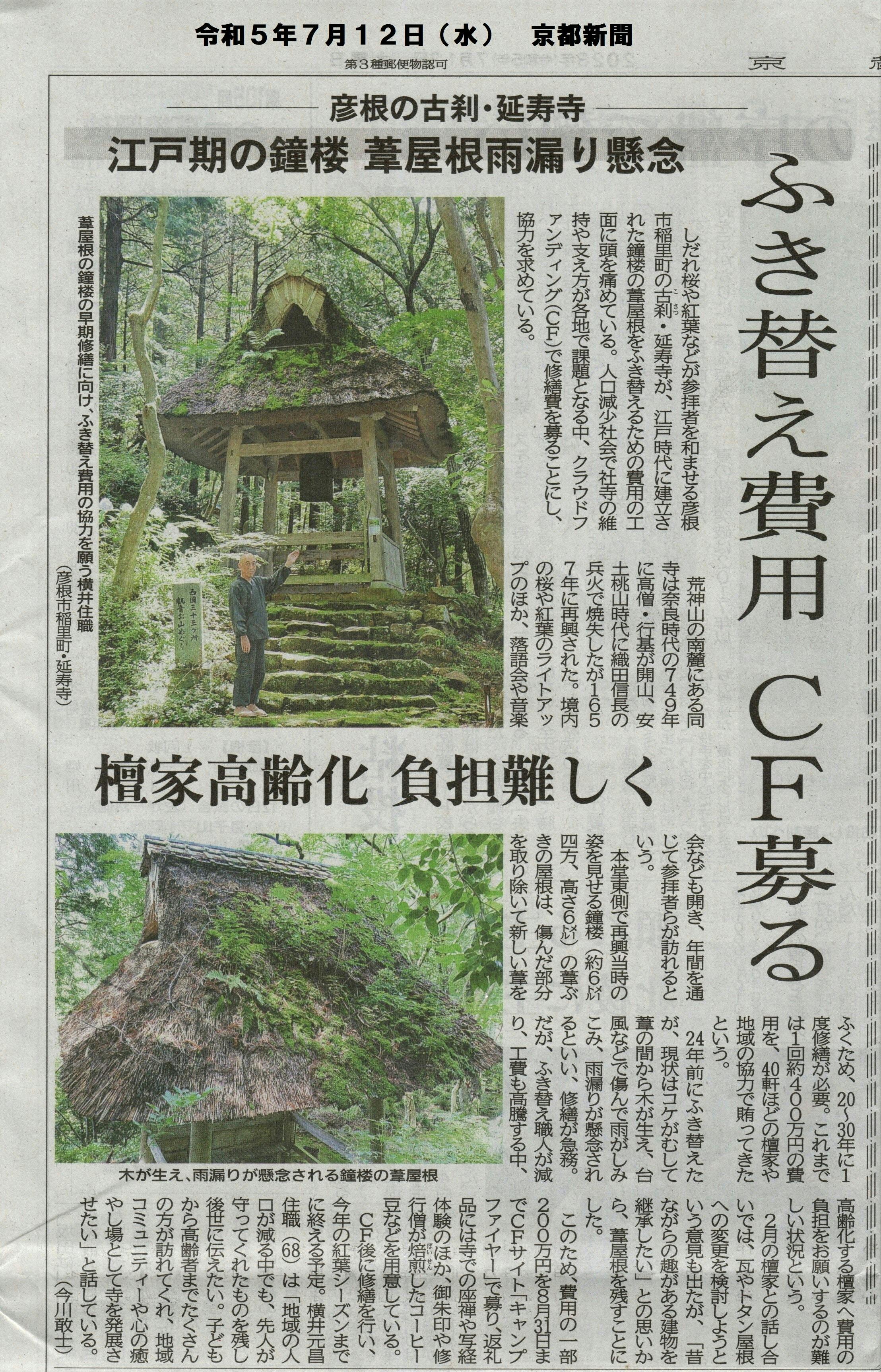 クラウドファンディングを始めて12日目に入りました。皆さまのご支援に感謝申しあげます。今朝の京都新聞に取り組みを掲載していただきました。(2023.7.12)