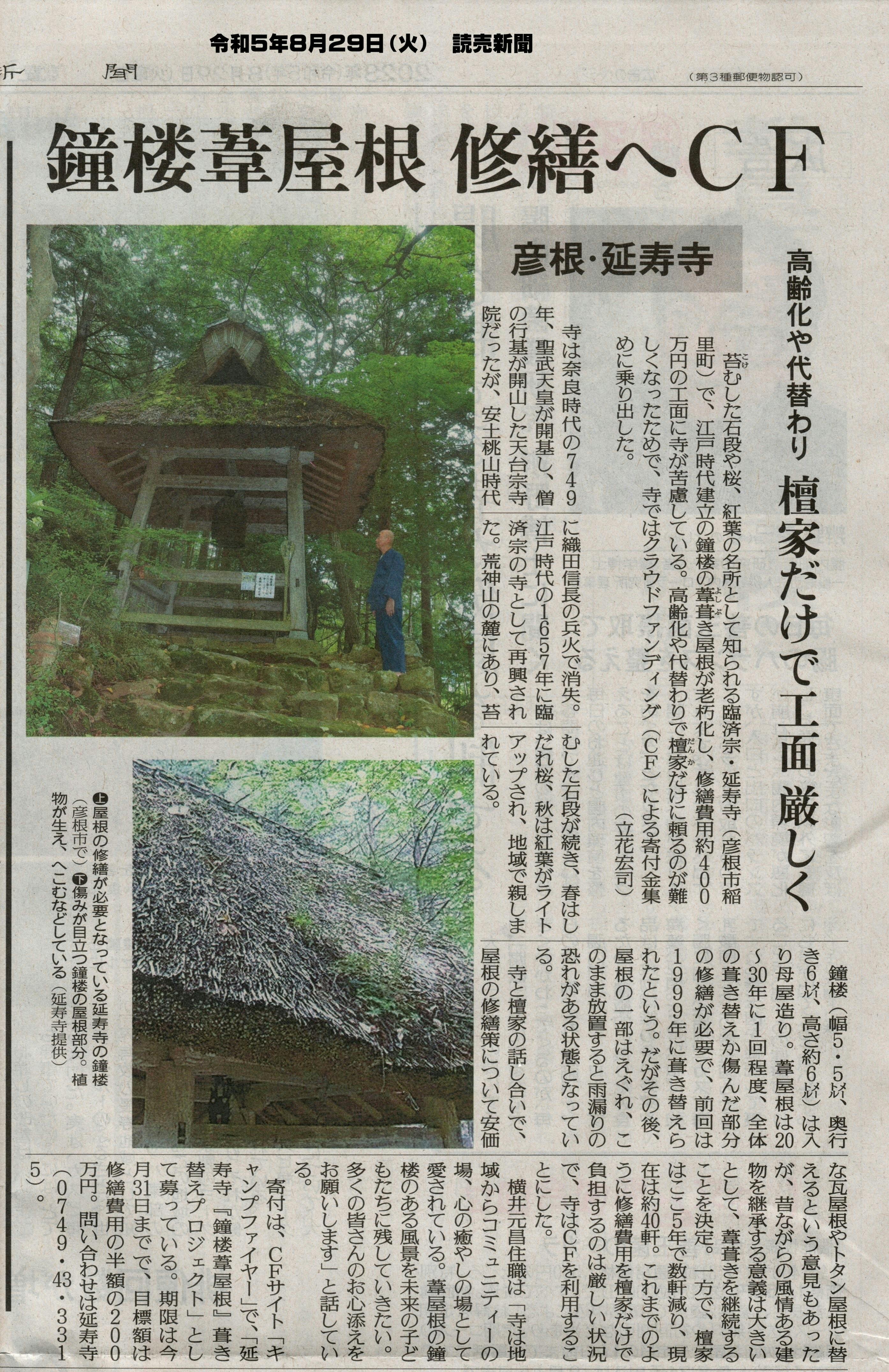 クラウドファンディングも残り2日となりました。皆さまのご支援に感謝申しあげます。今朝の読売新聞に取り組みを掲載していただきました。(2023.8.29)