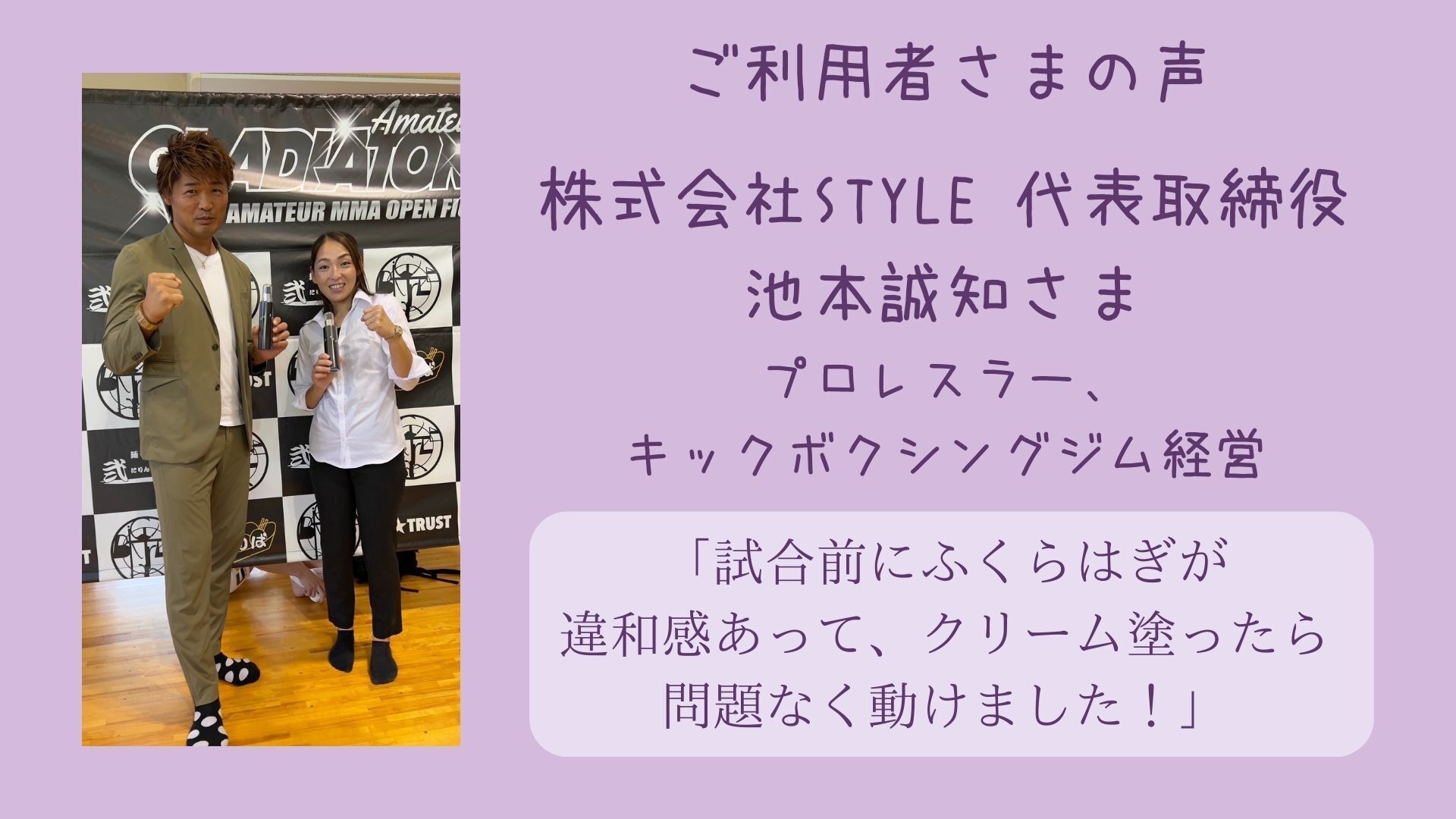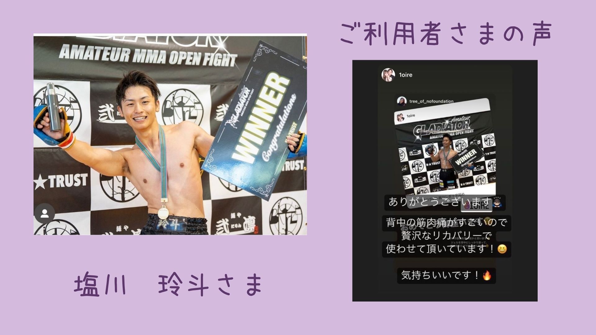 お店にお越しの方だけでなく、先日はアマチュア総合格闘技の大会でのスポンサーとしてゲルを協賛させていただきました。ご利用になった方の感想を一部を紹介いたします。