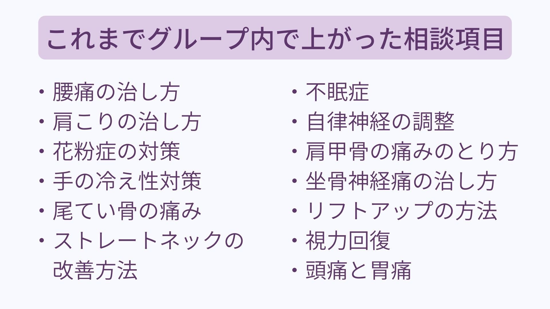 「腰痛の治し方」「肩こりの治し方」「花粉症の対策」「手の冷え性対策やストレートネックの改善方法」「尾てい骨の痛み」「頭痛と胃痛」「不眠症」「自律神経の調整」「肩甲骨の痛みのとり方」「坐骨神経痛の治し方」「リフトアップの方法」「視力回復」などなど…