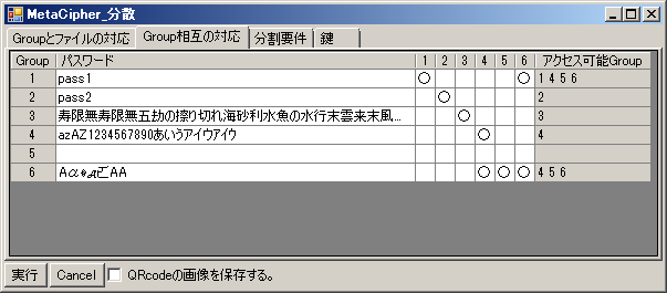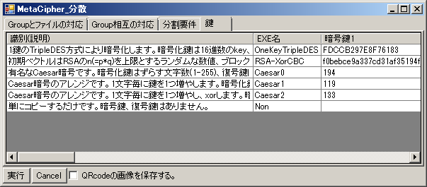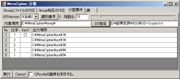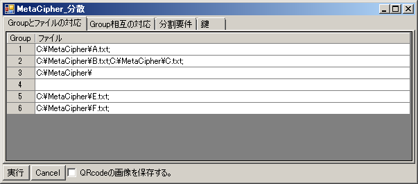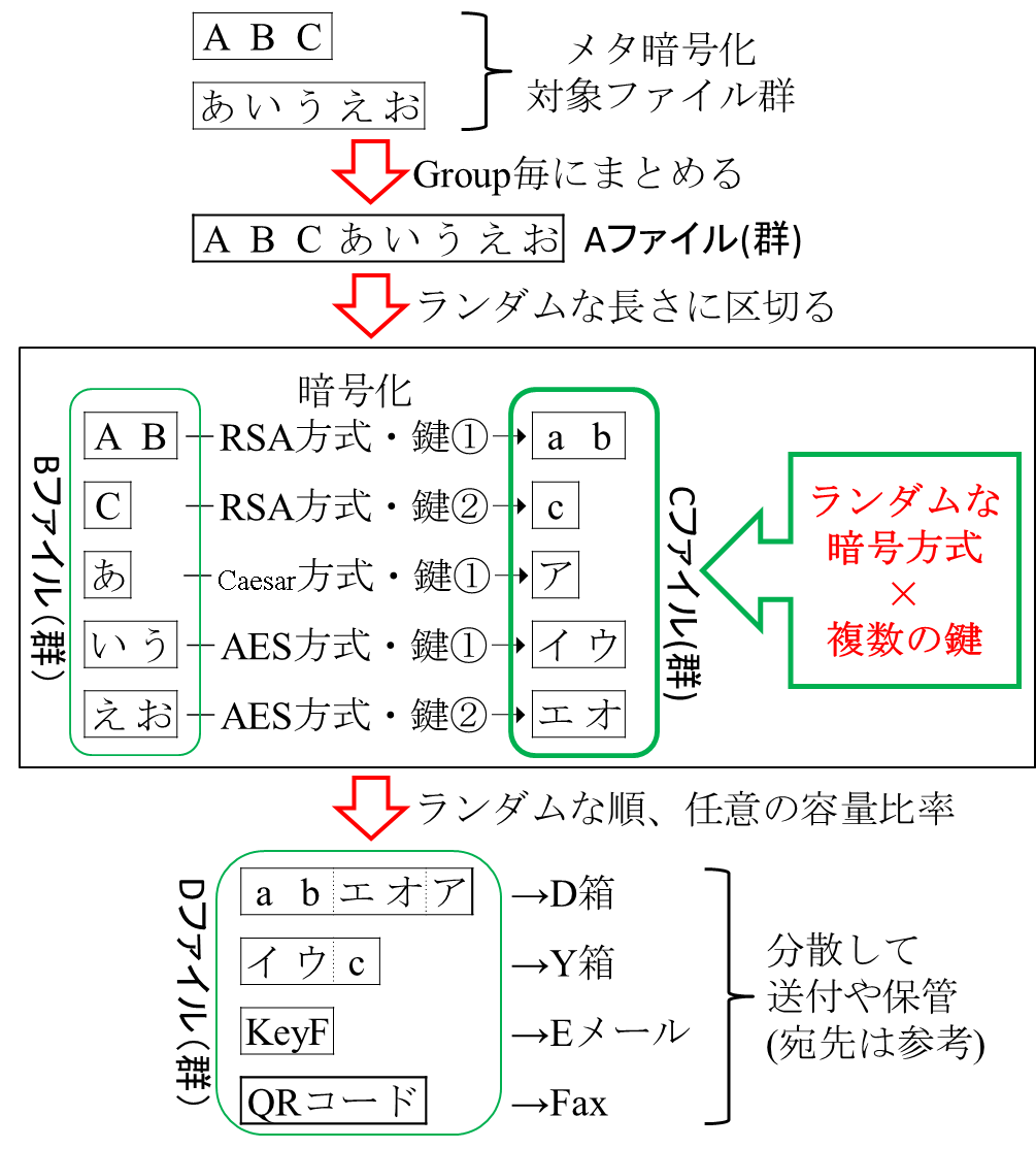 「分散アプリ」:「秘密にしたいファイル(群)」を、1~201Byteのファイルに分解します。各ファイル毎に「(暗号用)暗号exe(群)」による複数の暗号方式/複数の鍵で暗号化し、ランダムな並びで指定数・指定比率のファイルに再結合します。この時、「秘密にしたいファイル(群)」を複数の「Group」に登録することができます。