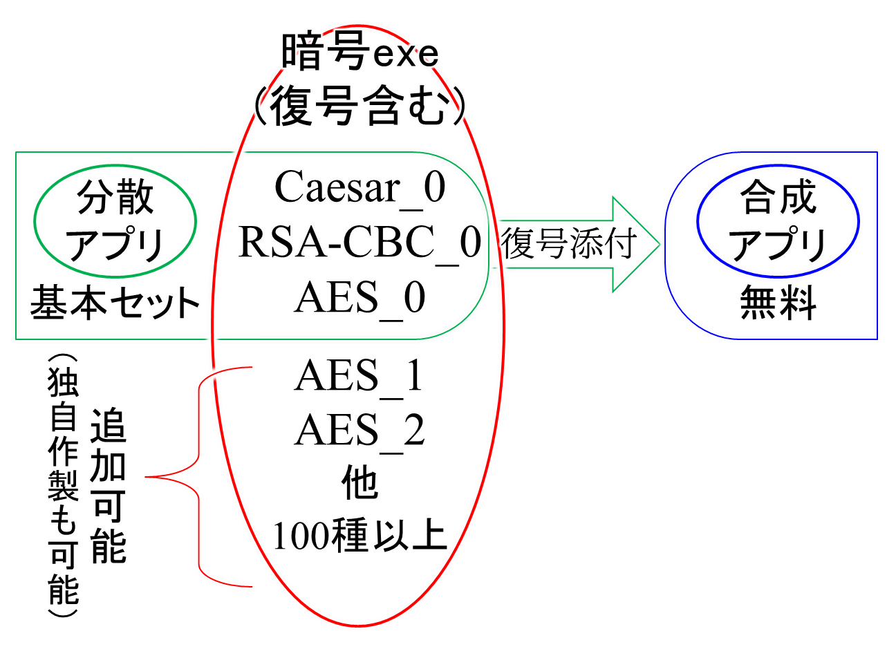 分散アプリ基本セット:「分散アプリ」と「暗号exe(群)」の「AES_0」「RSA-CBC_0」「Caesar_0」の4種の構成です。現状では、無料で配布の予定です。