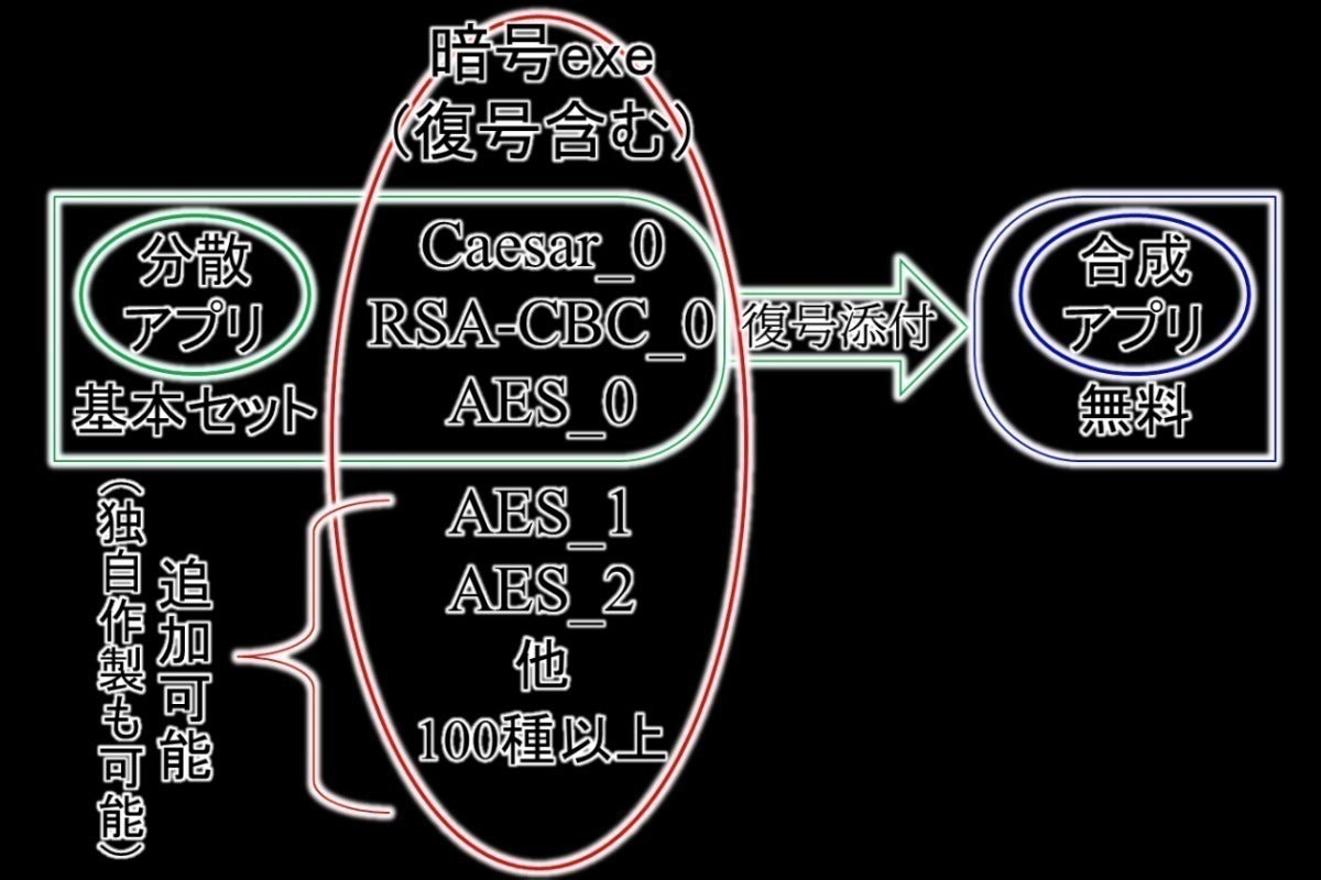 本アプリは、「分散アプリ」「合成アプリ」「暗号exe(群)」で構成しています。