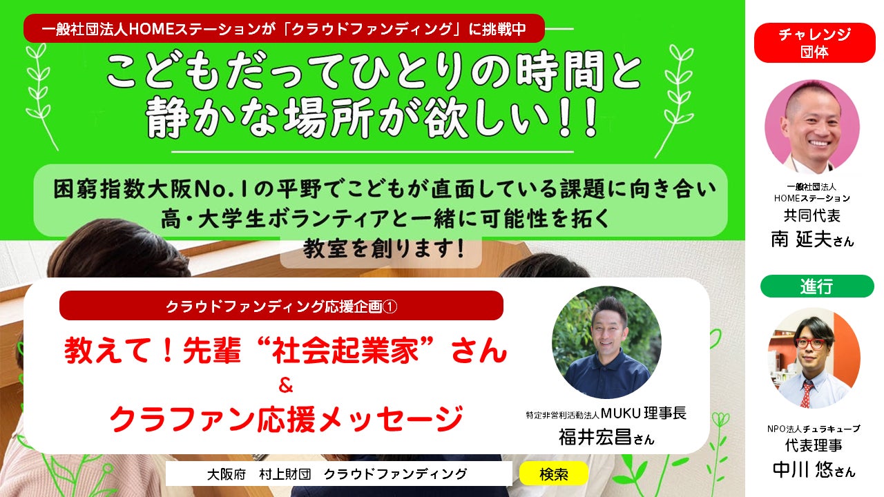 このプロジェクトの盛り上げ役になってくださる先輩「社会起業家」さんをゲストに招き・どんな活動をしているの?・どんな子どもたちの笑顔が生まれたの?・クラファン運営のコツは?などをどんどん質問していく、オンラインインタビューの動画配信をおこないました!第1回目のゲストは、特定非営利活動法人MUKUの福井さん!!わたくし南(HOMEステーション共同代表)と進行役の赤メガネ(中川さん)との3人のトーク、、、宜しければご視聴ください。https://youtu.be/t6-EoN1Olxo