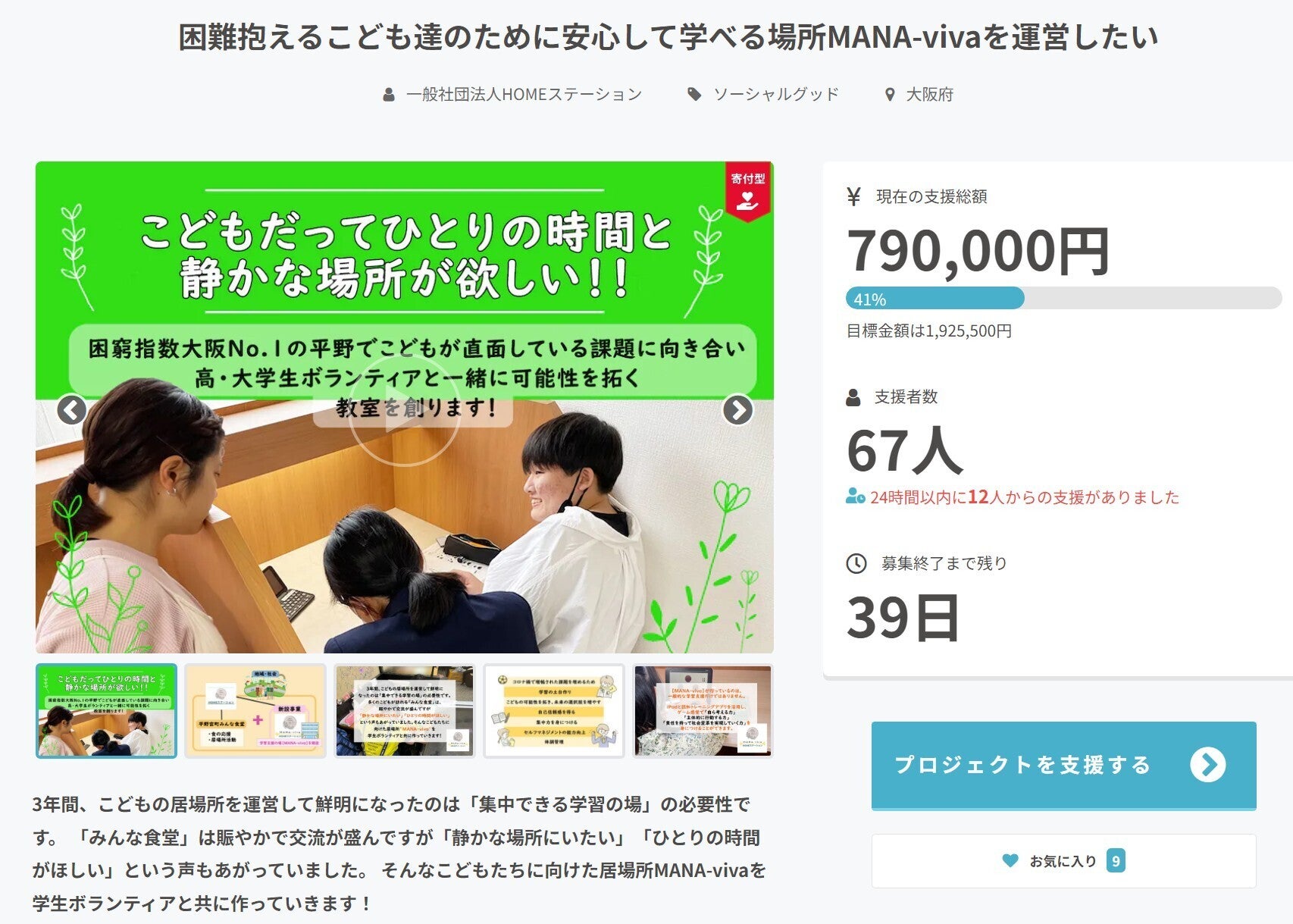渡辺さん(左)、松實さん (右)一般社団法人HOMEステーションさん代表の南さんには5年前、サイボウズが虐待防止の取り組みを発表したときにいち早くお問合せいただいて以来、交流を重ねています。コロナ禍の大変な状況のなか、ほっとできる居場所をと「平野宮町みんな食堂」を開設。サイボウズのkintone(キントーン)もとりいれながら新たなチームの連携モデルをつくり、チーム応援カフェというサイボウズの非営利向けのイベントにもご登壇くださり、多くの方の参考になる話をしてくださいました。今回、こども達に対し非認知能力向上と学習習慣の定着や良質なコミュニケーションの体得ができる場となるためのクラウドファンディングをされるとのこと心より応援しています。 ▽一般社団法人HOMEステーションの南さん、西垣さん(ボランティアでkintoneを指南)によるkintone事例記事『子どもの見守りを担う「平野宮町みんな食堂」のkintone活用』https://npo.cybozu.co.jp/blog/post/170/________________________サイボウズ株式会社の渡辺さん・松實さん、応援メッセージありがとうございます。普段の活動でもkintoneのチーム応援ライセンスをご提供いただき本当に助かっています。食堂にやってくる子どもに気掛かりなことがあると記録しておけるので、大阪市や平野区と「子どもの見守り強化事業」の連携をするうえでも大いに役立っております。今後もさらに活用させていただきます。