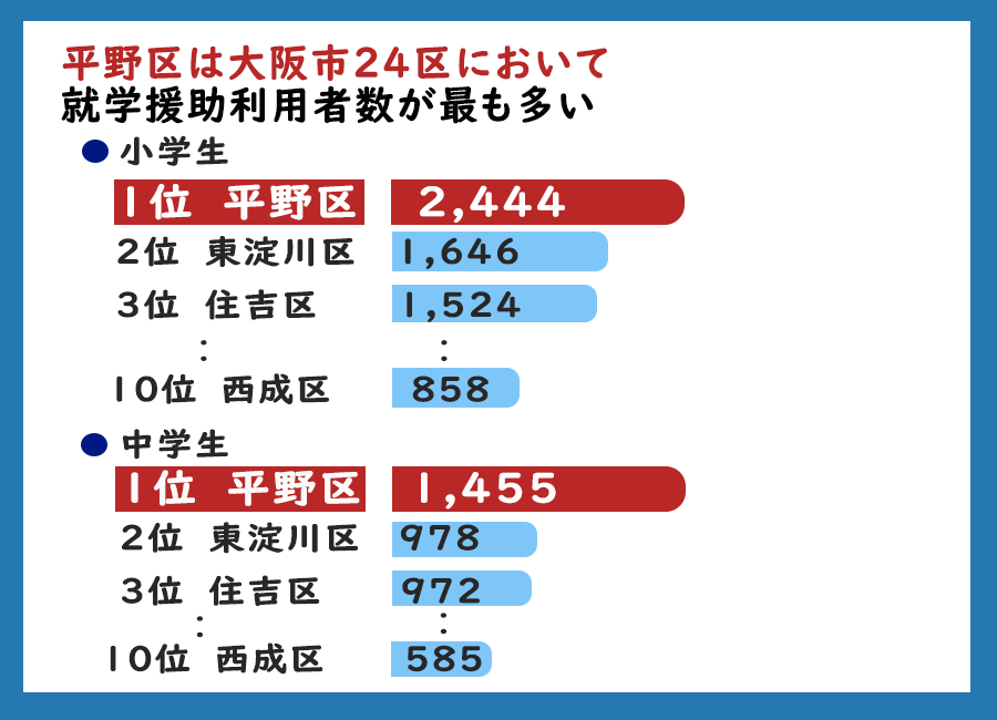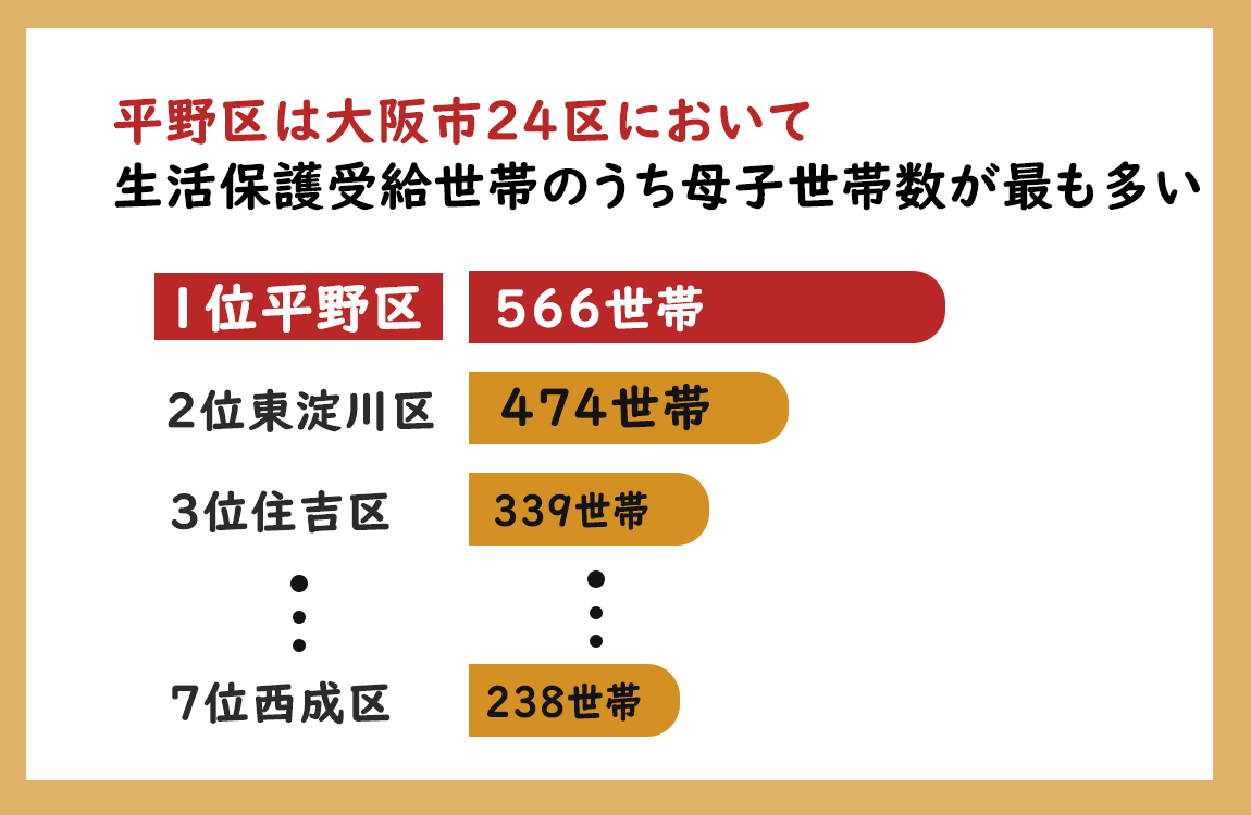 大阪市24区の中で、平野区の特徴として注目されているのが、生活保護受給世帯のうち母子世帯数が最も多いということ。そして、子どもがいる世帯を対象にした就学援助(経済的理由により就学が困難な児童生徒に対する、学用品代や給食費などの援助)の利用者数が、小学生・中学生ともに最も多いということ。多くの子どもたちが、経済的な原因で、難しい現実に直面しているのです。