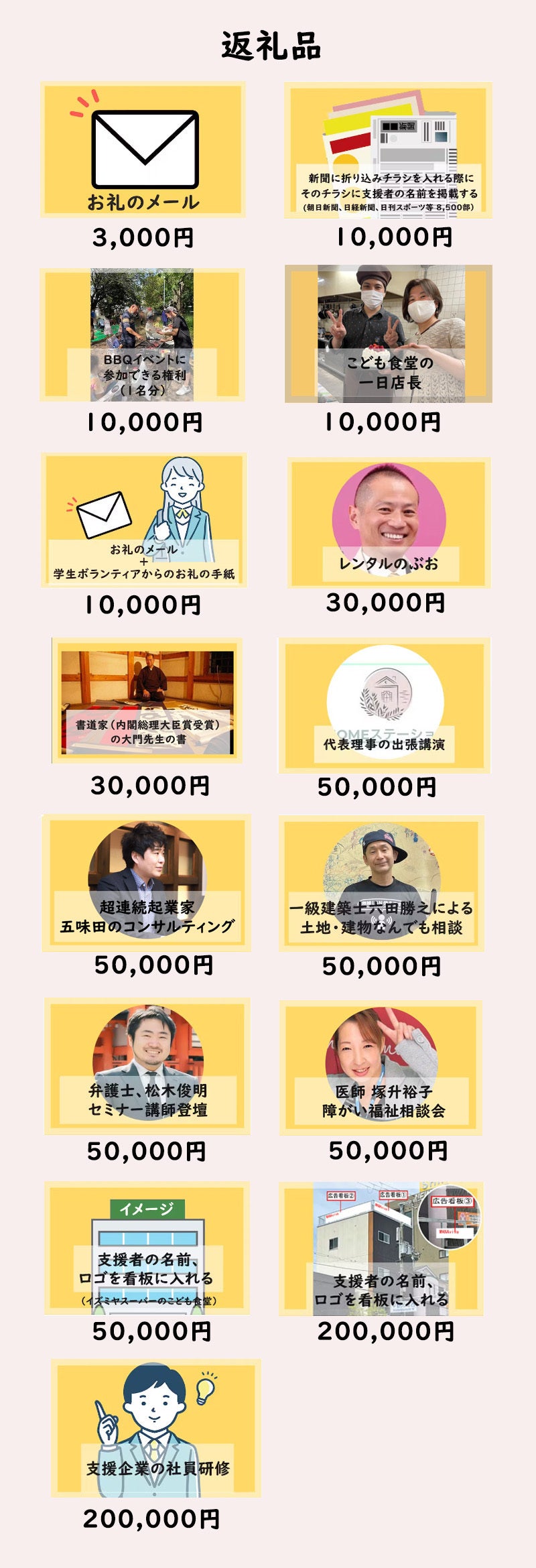 私たちは大阪市を中心に『頼れる大人がいないあなたへ』というメッセージコンセプトを掲げ、アフターケア事業、そして、平野宮町みんな食堂という場所で、「食」の応援事業・こどもの居場所事業を行っています!※ アフターケア事業(=児童養護施設等卒園者などのなにかの理由で親に頼れないこども・若者の支援)