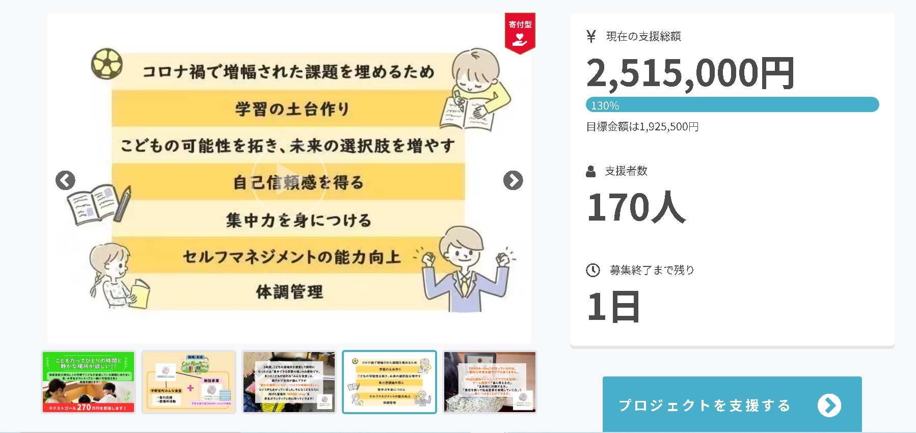 マッチング寄附方式のクラウドファンディング成立が叶うとこどもたちは落ち着いた環境で、力を伸ばせるコンテンツで学ぶことができます。