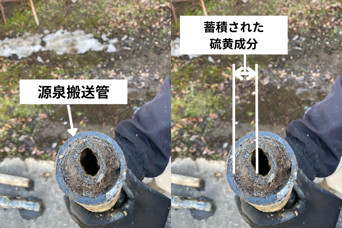 硫黄成分の豊かさは、源泉を搬送するパイプ内側に硫黄の塊がたちどころに蓄積されるほど。