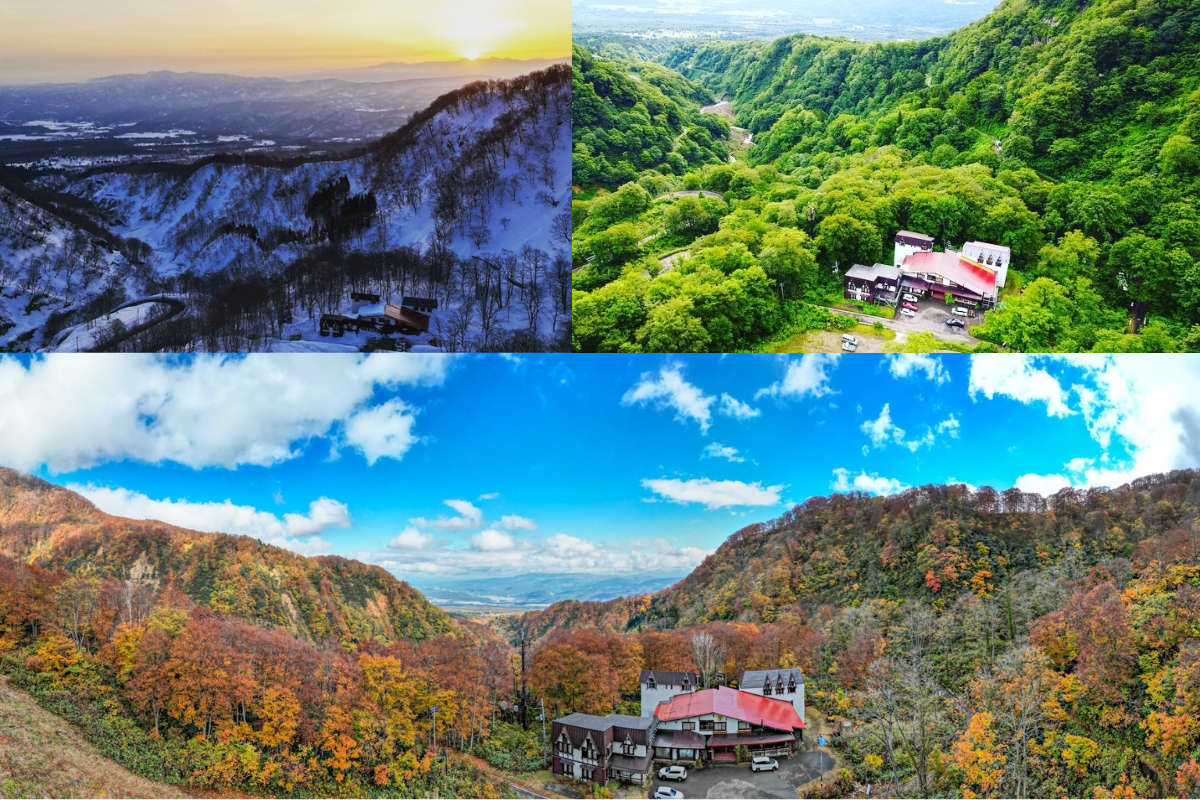 標高2,454mの妙高山中腹にある燕ハイランドロッジ遠景 (上)初夏(下)冬