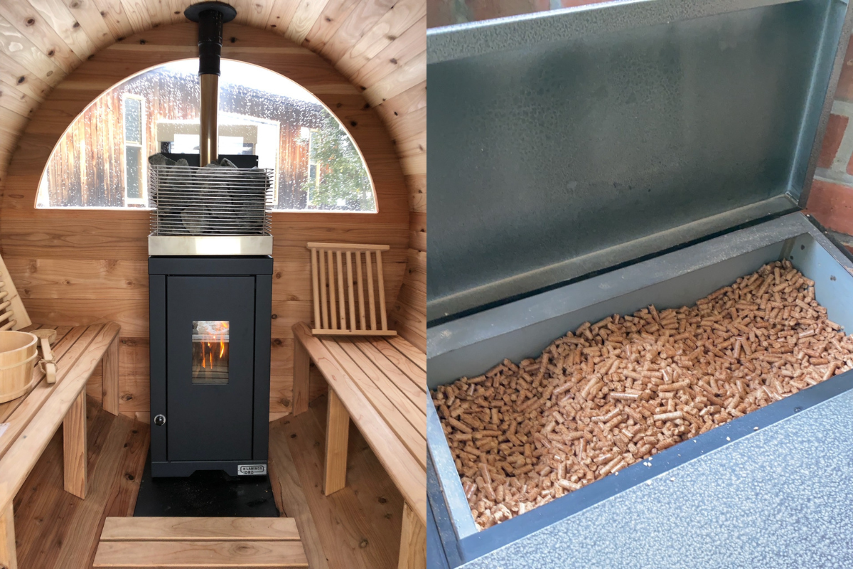 電気・ガスを使わないサウナストーブ(左)と、燃料となる木製ペレット(右)