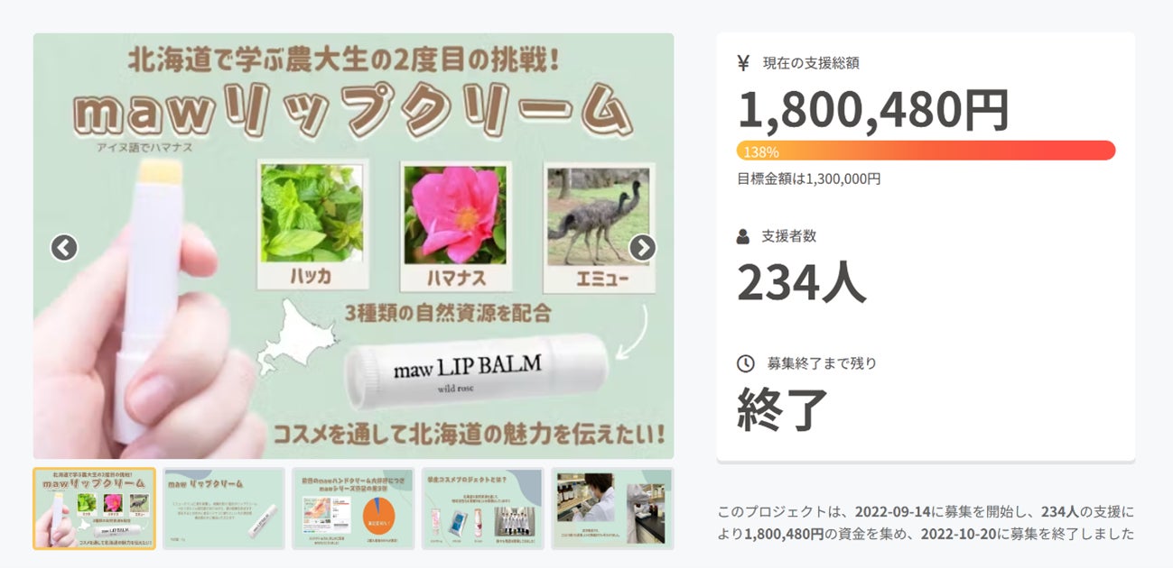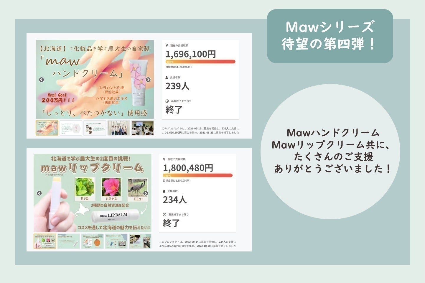 Mawシリーズの化粧品はこれまでにハンドクリームやリップクリームなどが開発されており、そのどちらもクラウドファンディングで目標金額を超えるご支援をいただきました。