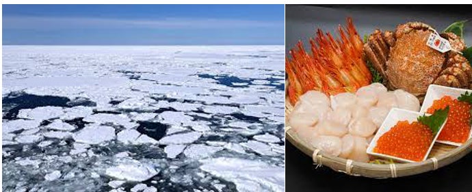 左)オホーツク海の流氷の様子 右)網走の海産物