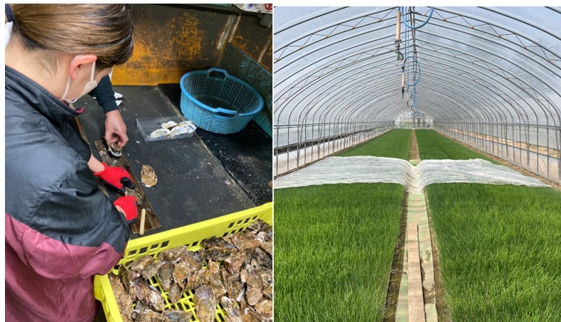 左)牡蠣漁師さんの下で実習 右)玉ねぎ農家さんのアルバイトでの写真