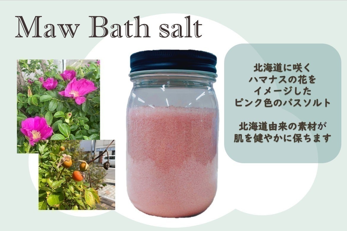 Mawバスソルトは、ハマナスの花びらを意識したピンク色が特徴のバスソルトです。湯船に溶かして使用すると、お風呂いっぱいにオホーツクの自然をイメージして調香した「オホーツクブーケの香り」が広がります。