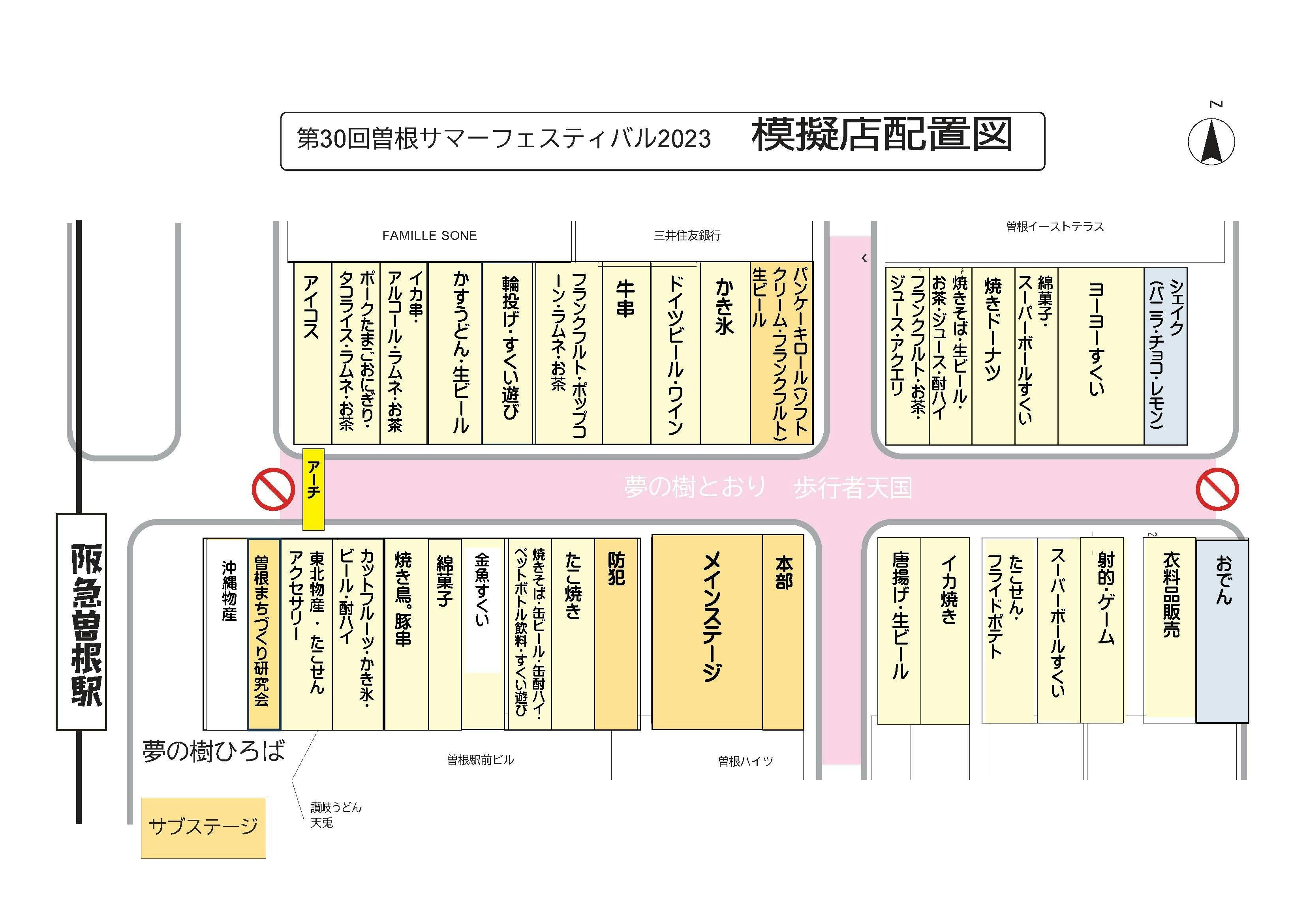 曽根駅前東側交差点噴水の時計台がある夢の樹広場と、東側交差点から更に東側の、角にセブンイレブンがある交差点までを歩行者天国とし、両側歩道での模擬店やステージ発表、盆踊り等が行われます。