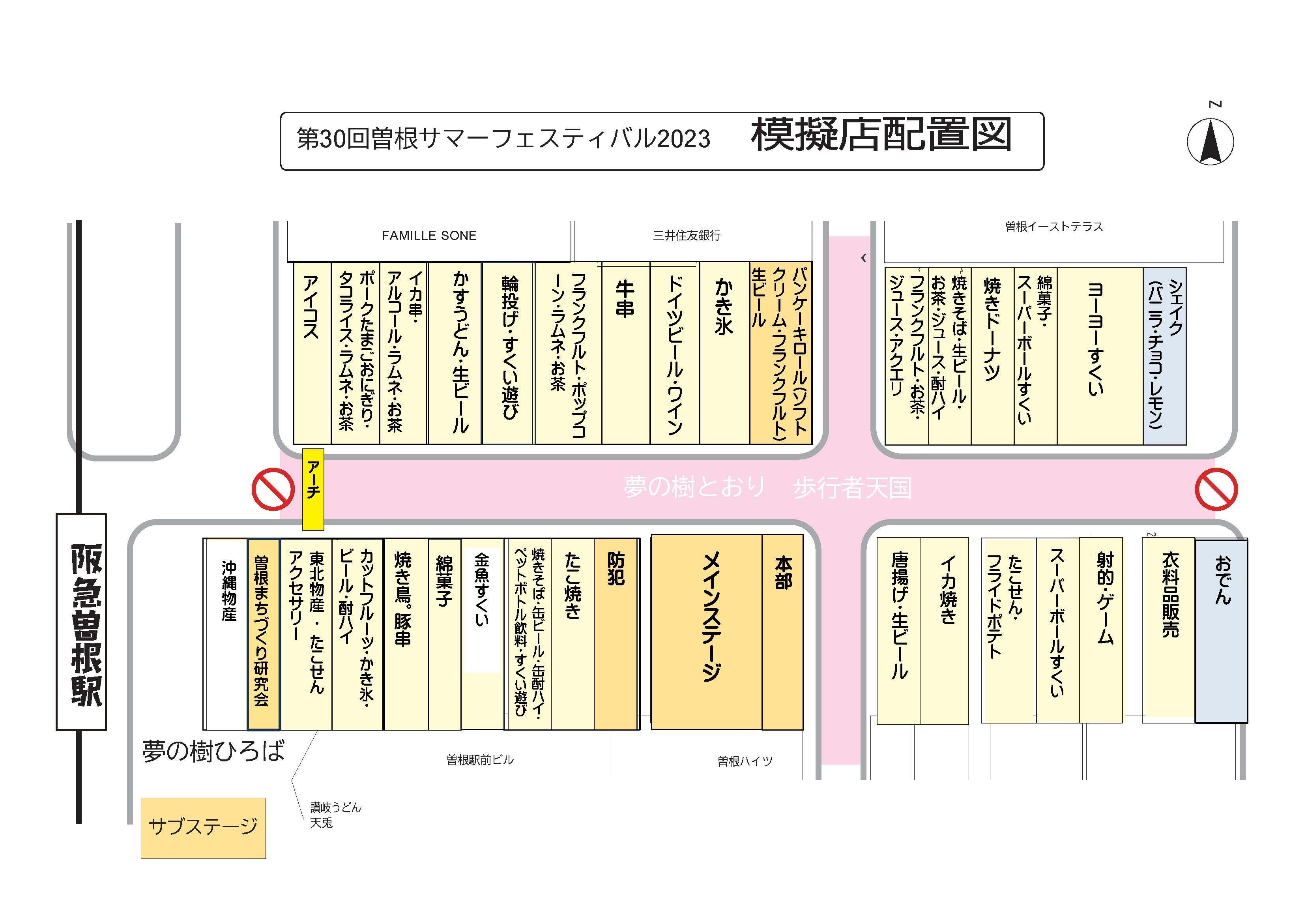 曽根駅前東側交差点噴水の時計台がある夢の樹広場と、東側交差点から更に東側の、角にセブンイレブンがある交差点までを歩行者天国とし、両側歩道での模擬店やステージ発表、盆踊り等が行われます。