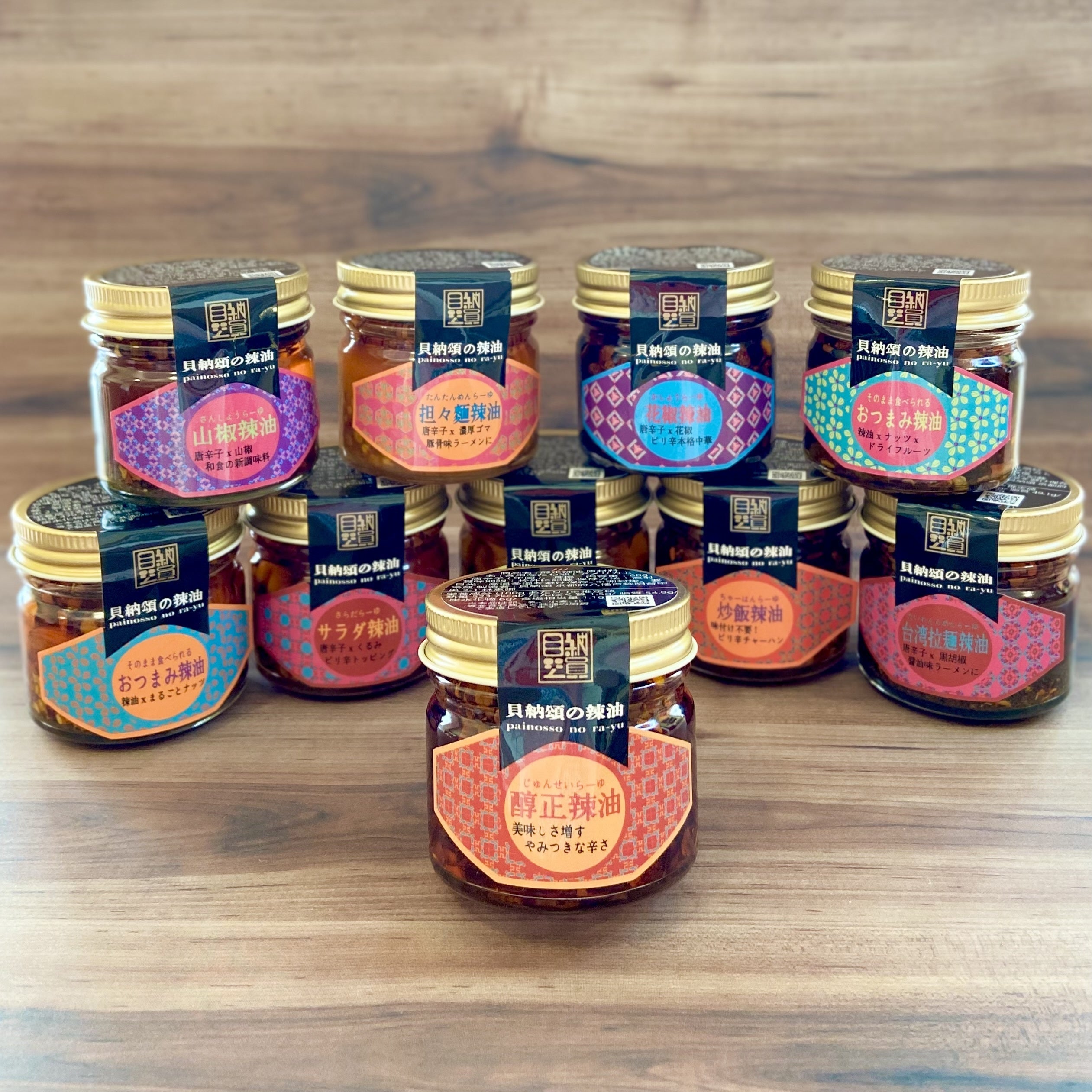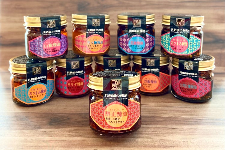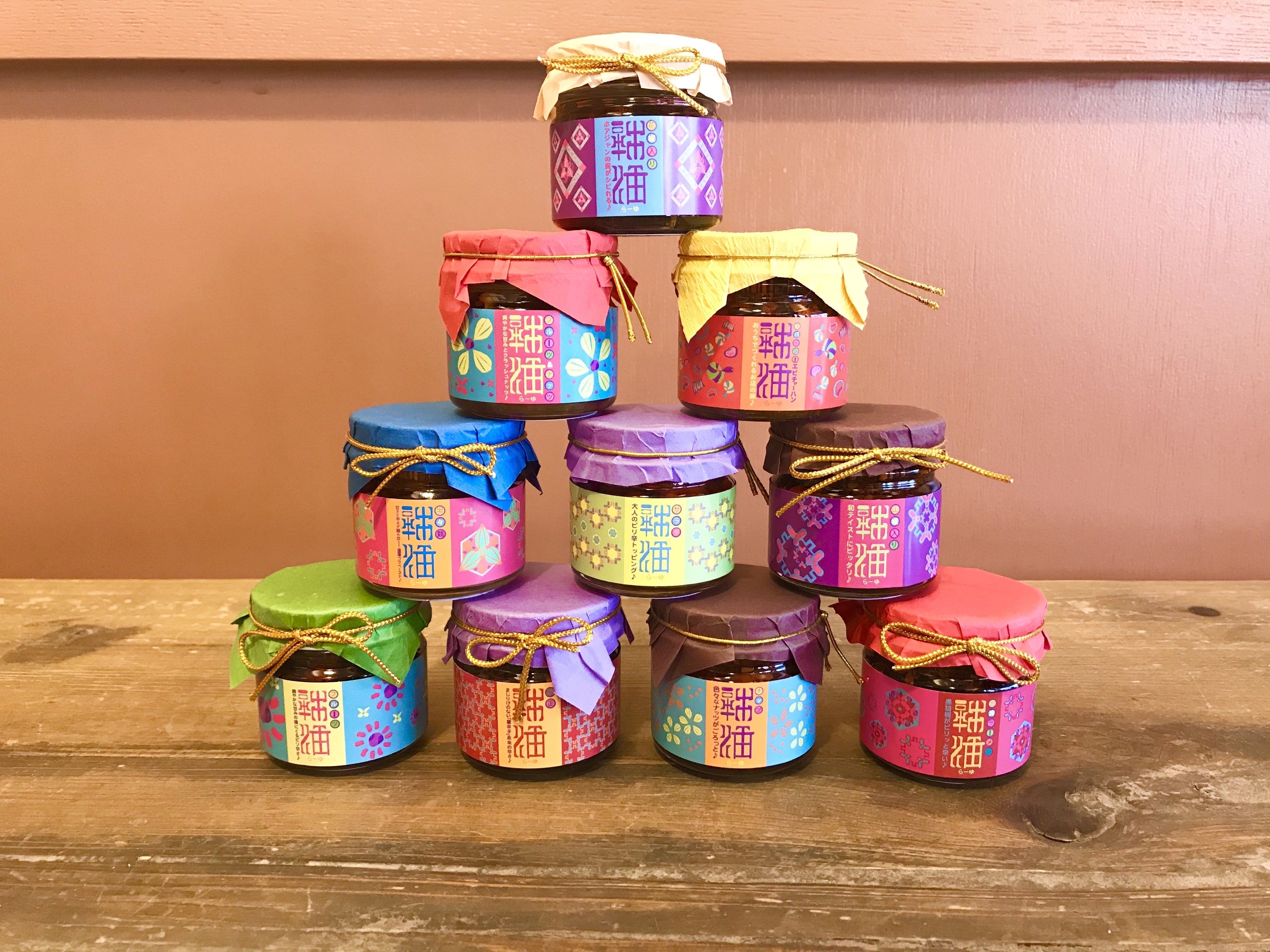 この醇正辣油を販売した数年が経った頃、ある方からのアドバイスを受け、辣油の種類を増やす事に挑戦し、2019年夏に醇正辣油を基本とし、更に9種類の辣油を作り、合計10種類の辣油が完成しました。
