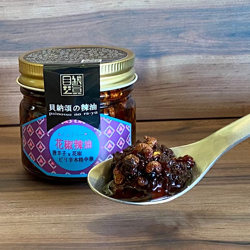 ・花椒辣油・・・中国の山椒”花椒”の実と豆味噌入り。炒め物や麻婆豆腐に入れると本格中華に。白ご飯のお供や冷ややっこの薬味としてもオススメ。