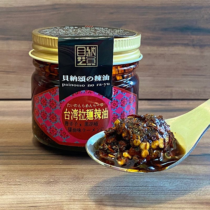 ・台湾拉麺辣油・・・インスタントラーメンが当店人気の”台湾ラーメン”に早変わり。醤油味のインスタントラーメンがオススメ。唐辛子と黒胡椒、二種類の辛さが楽しめる。当店辣油シリーズの中で一番の辛さ!