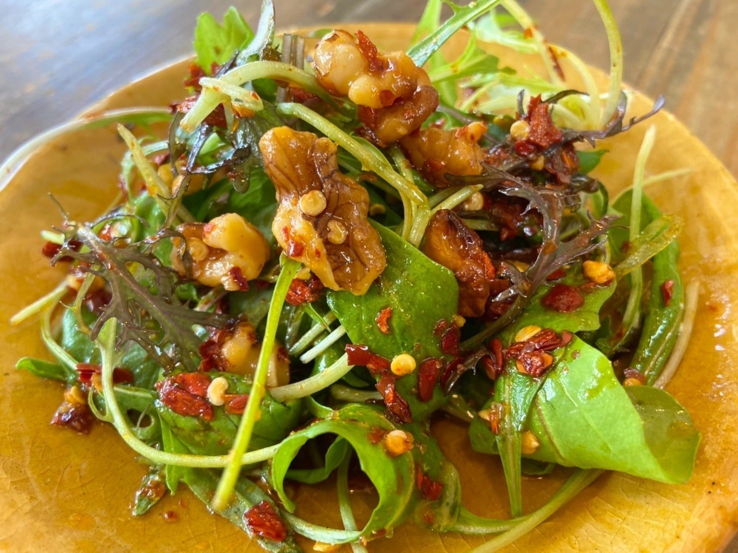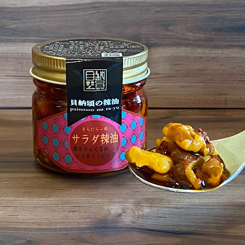 ・サラダ辣油・・・ローストしたクルミを砕いて辣油に漬け込んだ、サラダ用の辣油。塩味もあるので、グリーンサラダにかけるだけでOK。マヨネーズと混ぜ合わせるとディップソースに。酢と砂糖と混ぜれば、スイートチリドレッシングの出来上り。