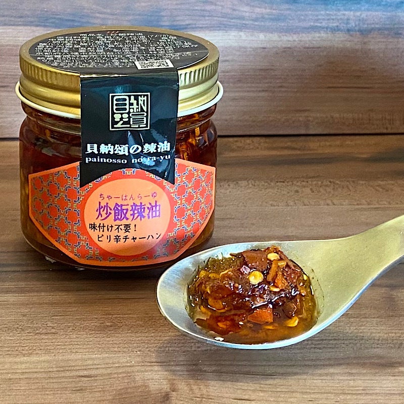 ・炒飯辣油・・・当店人気メニューの”スパイシーエビチャーハン”用辣油。中華調味料が入った味付け辣油なので、この辣油以外の調味料は不要。”スパイシーエビチャーハン”のレシピ公開中!