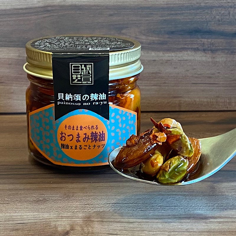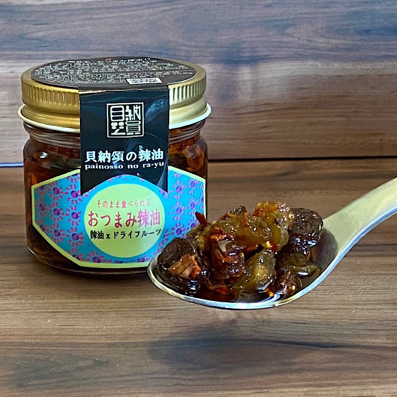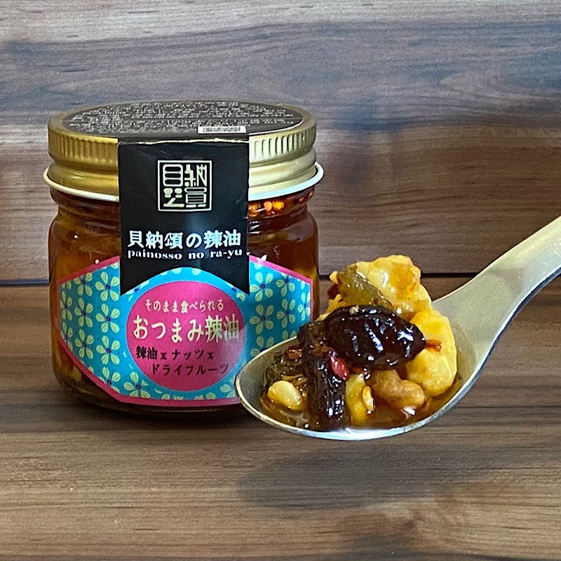 ・おつまみ辣油(フルーツ&ナッツ)・・・ドライフルーツとローストしたクルミを辣油に漬け込んだ”おつまみ辣油”。クリームチーズをはじめとする乳製品との相性抜群。バニラアイスにトッピングするとアイスクリームの甘さと辣油のピリ辛さ、クルミとドライフルーツの食感や味が重なりあっていつもと違う味わいに。残った辣油も使える1瓶で2度楽しめる”おつまみ辣油”。